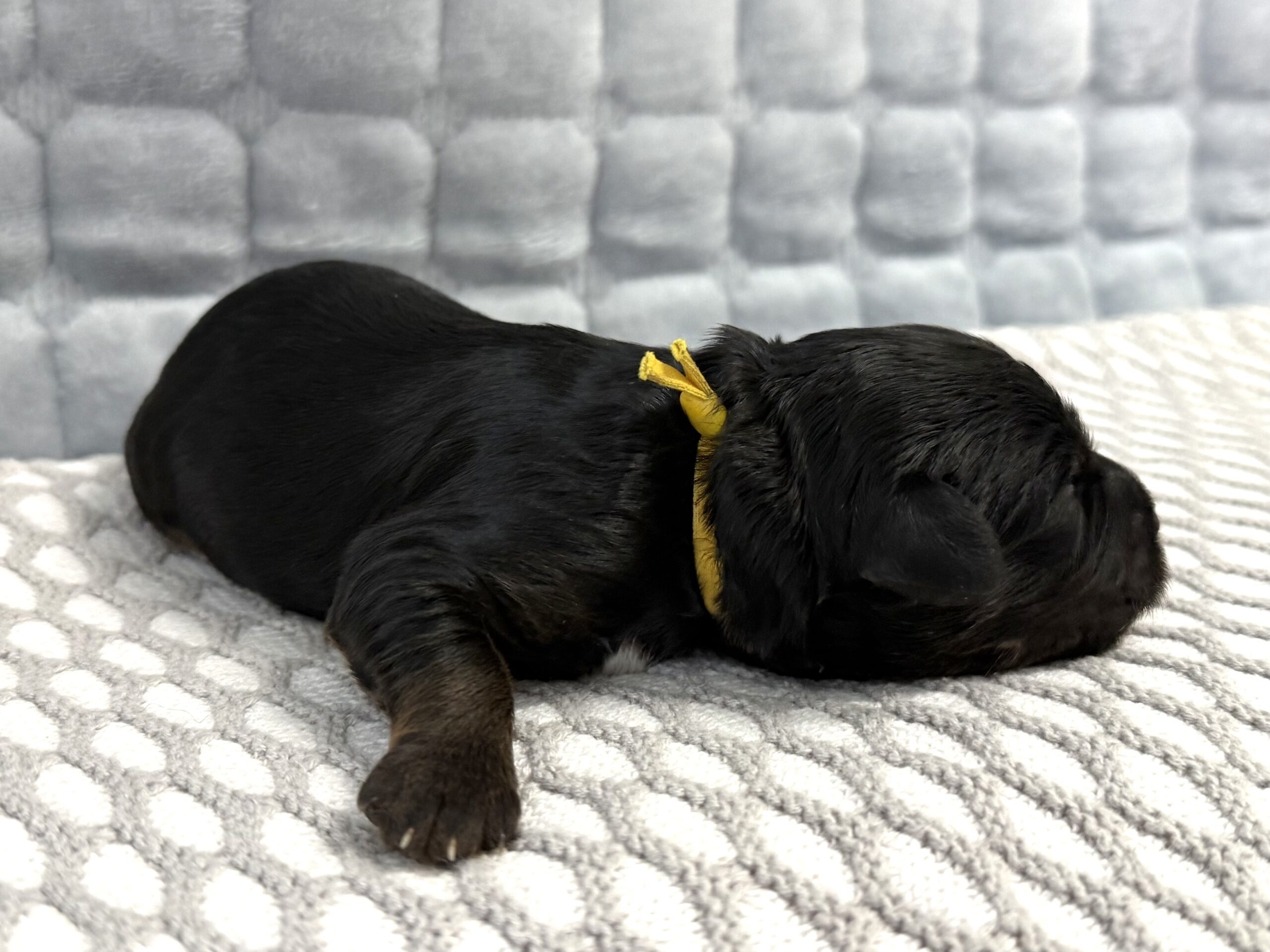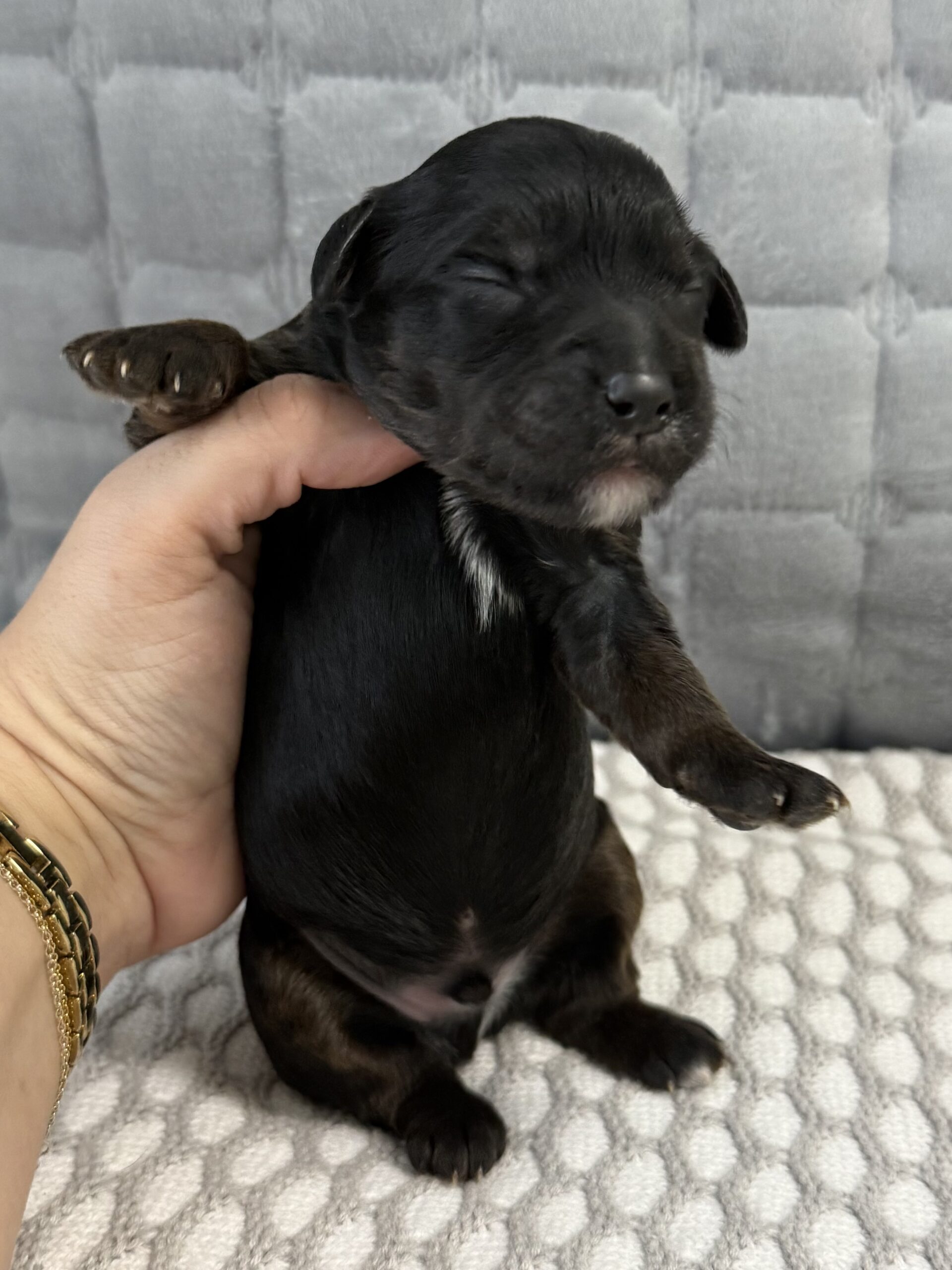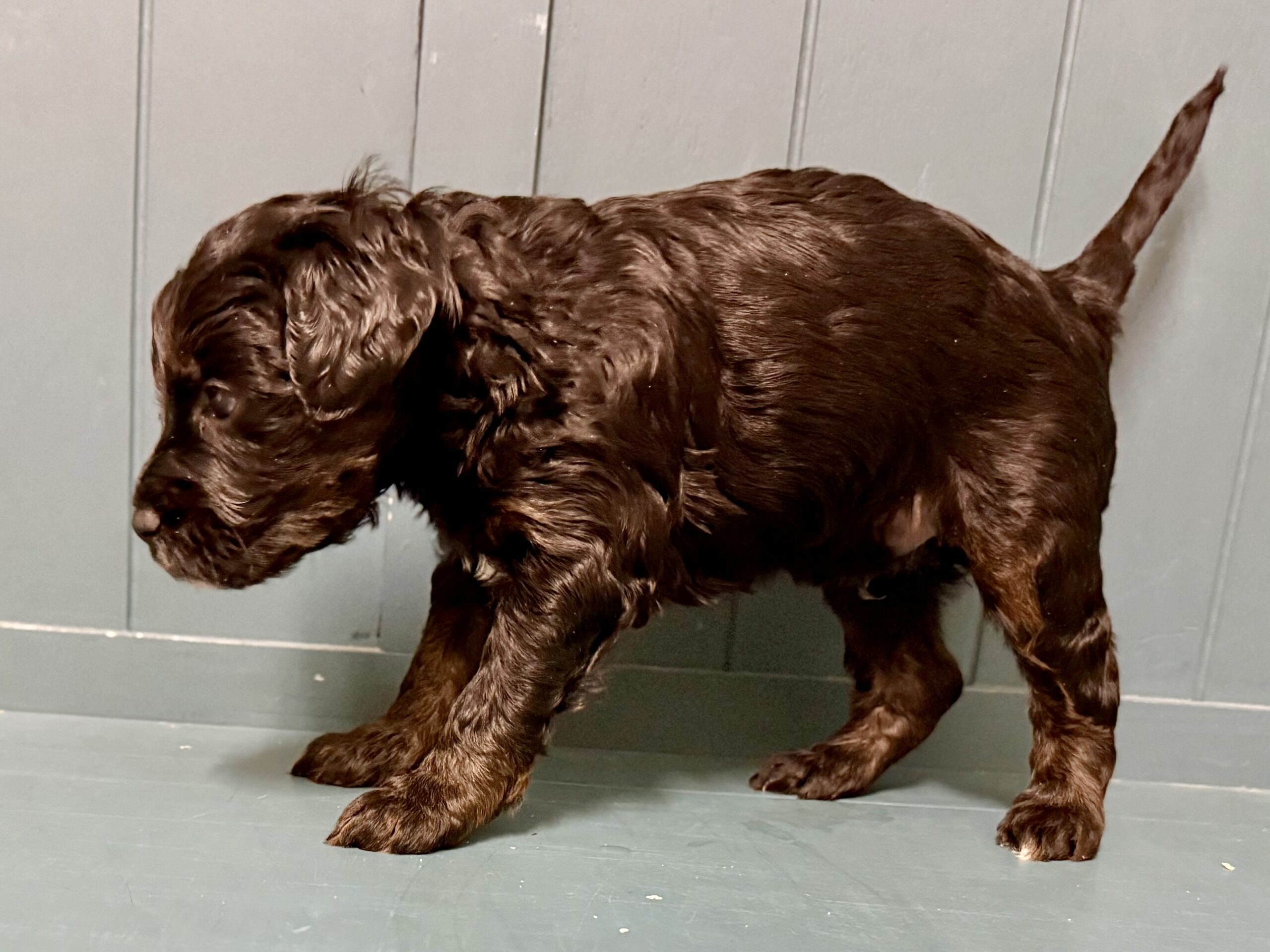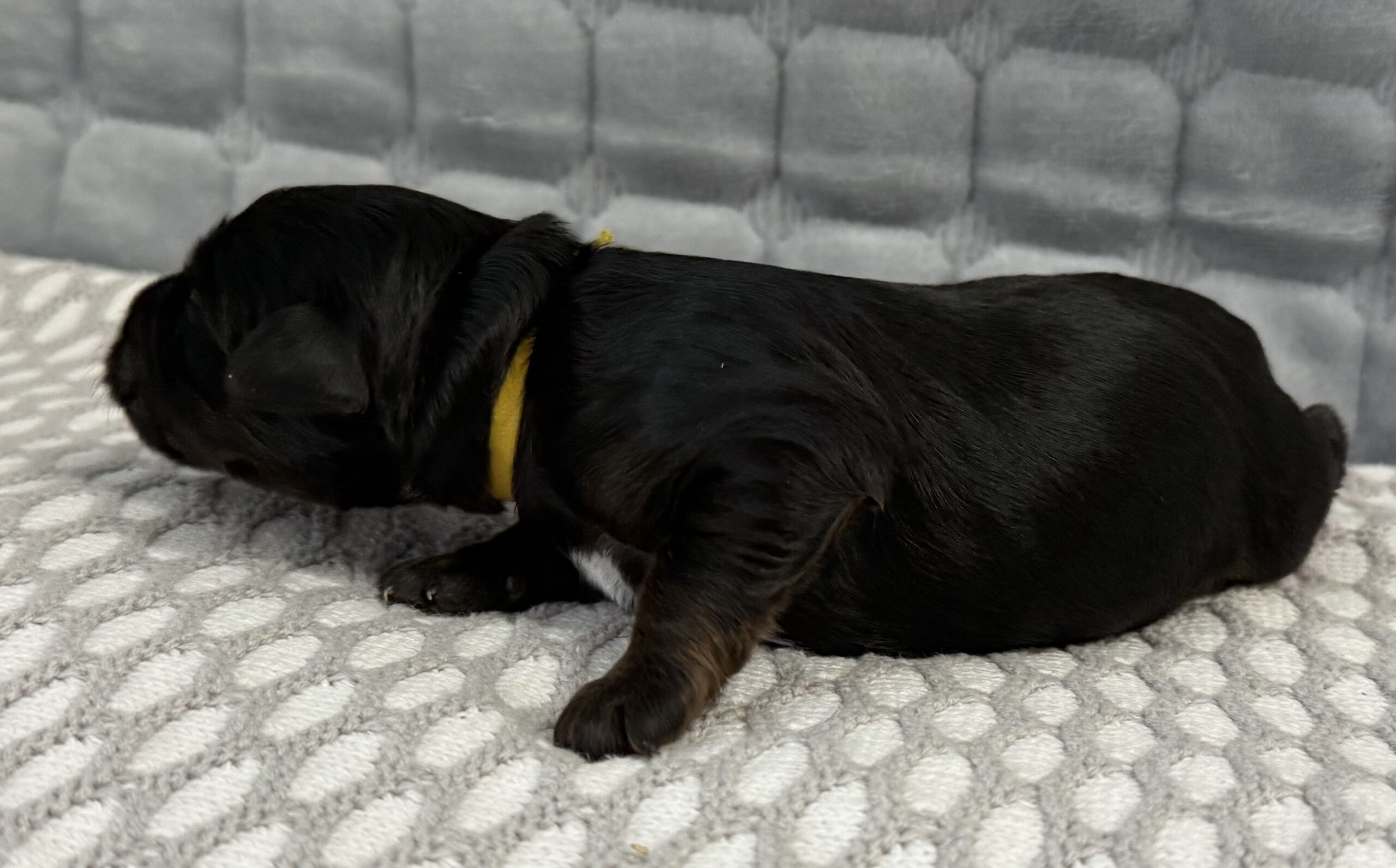 Rubble is from our Paw Patrol litter. I see faint brown markings on his legs and eye brows so I think those will become more obvious and that he is a black phantom color. He looks to have a wavy coat but we know it will be non-shedding. This litter was born November 18th and will be 8 weeks old January 13th. We will have a better idea as they grow but we expect them to be in the 20-25 range based on the parents.