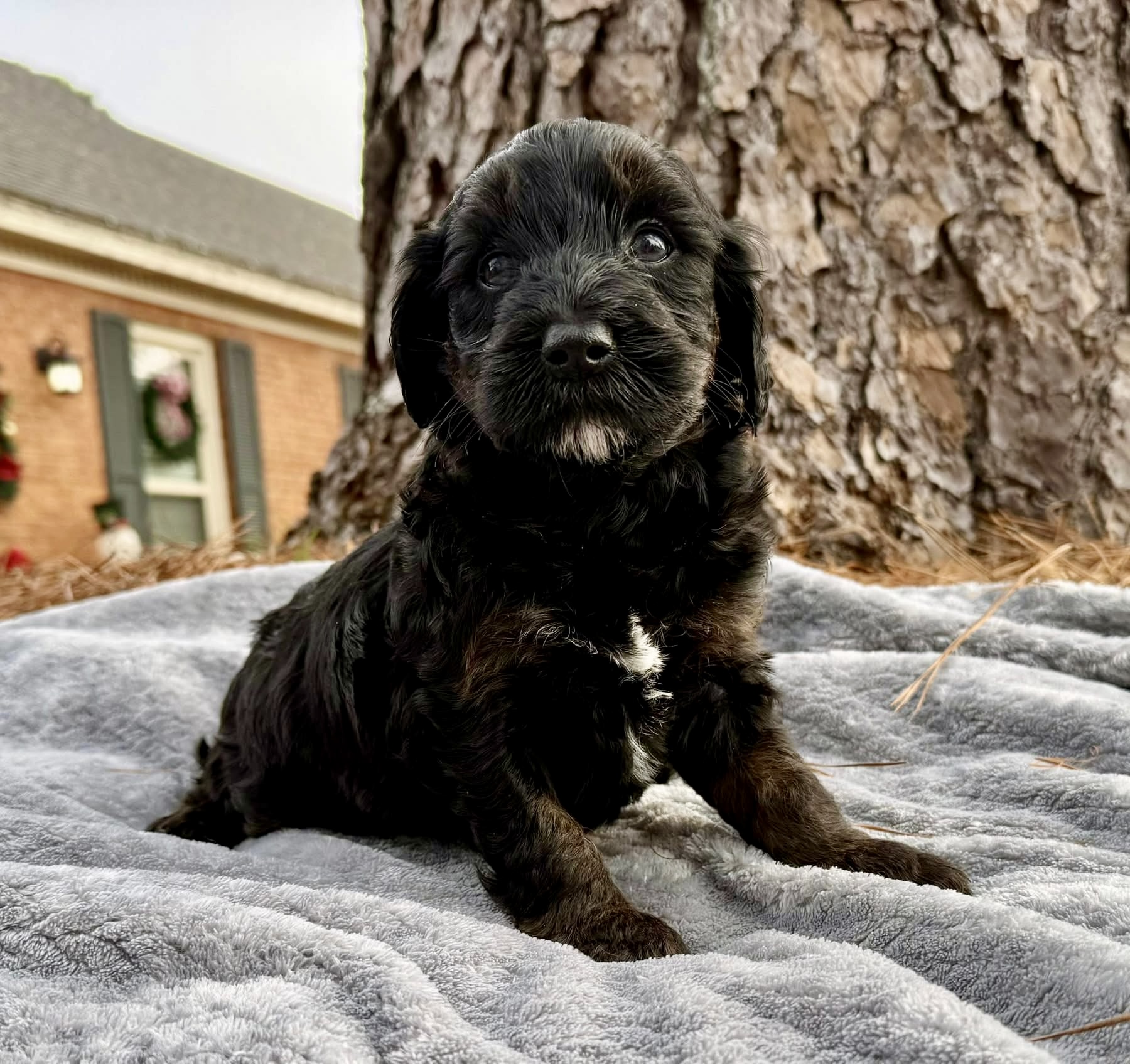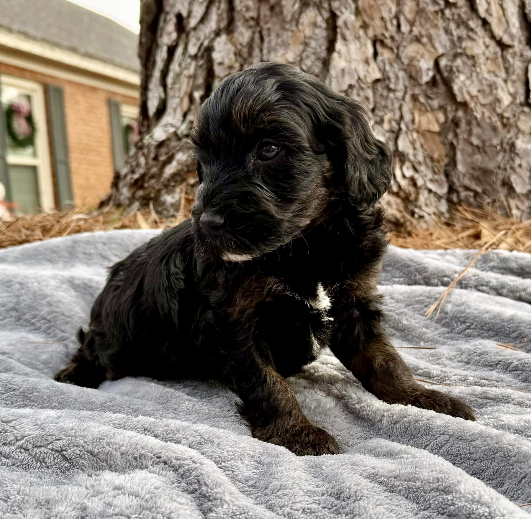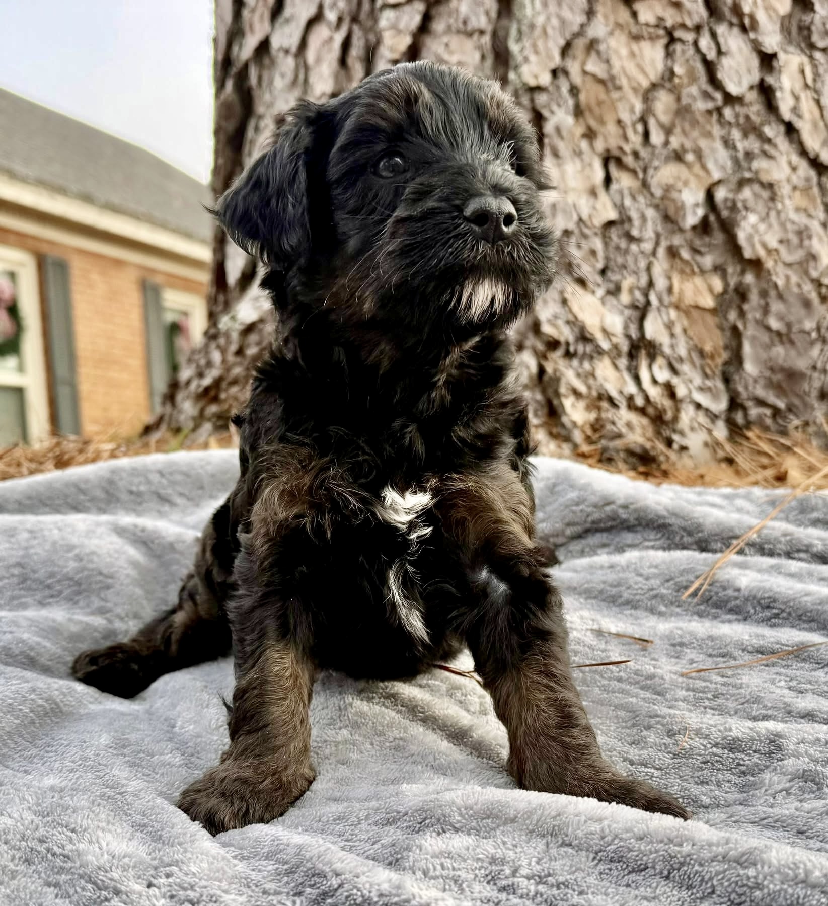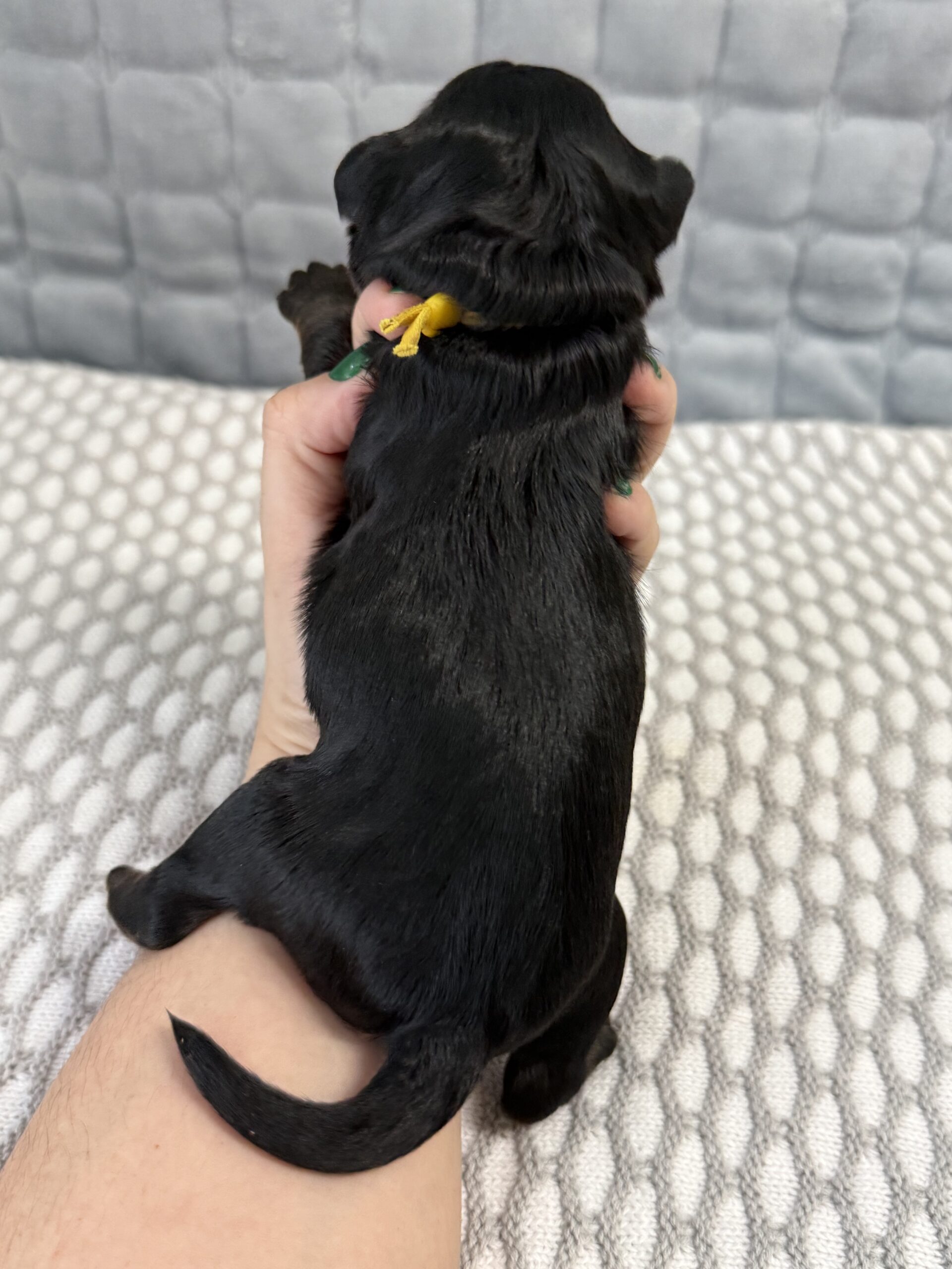 Rubble is from our Paw Patrol litter. I see faint brown markings on his legs and eye brows so I think those will become more obvious and that he is a black phantom color. He looks to have a wavy coat but we know it will be non-shedding. This litter was born November 18th and will be 8 weeks old January 13th. We will have a better idea as they grow but we expect them to be in the 20-25 range based on the parents.