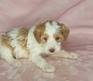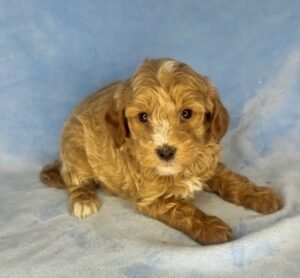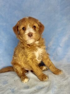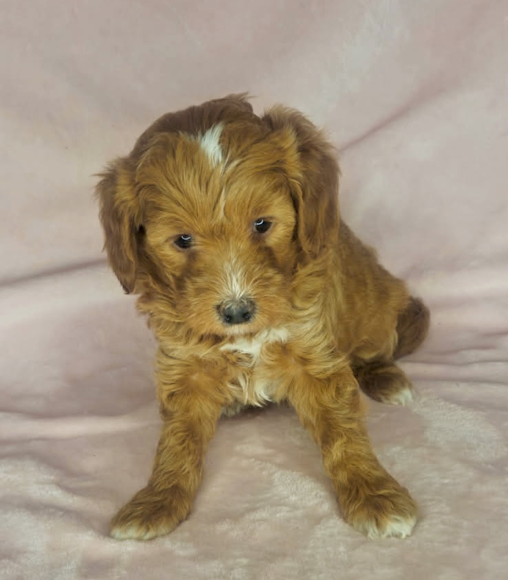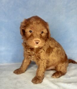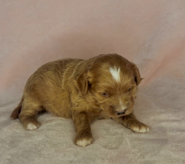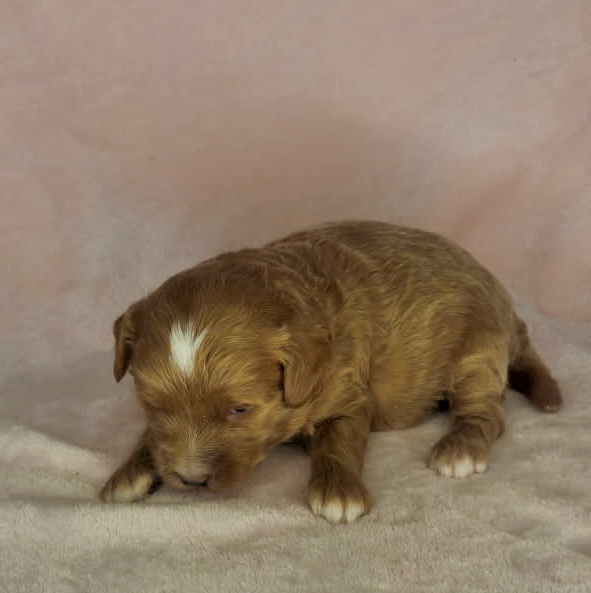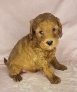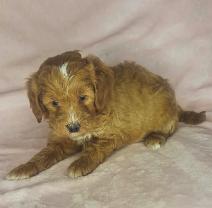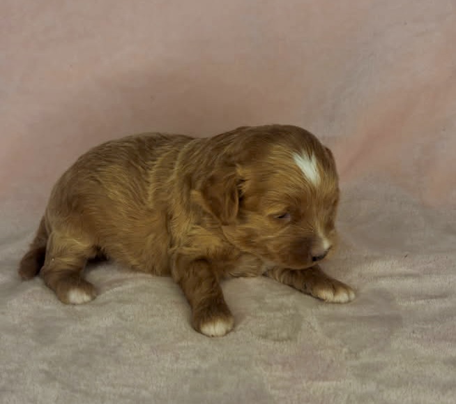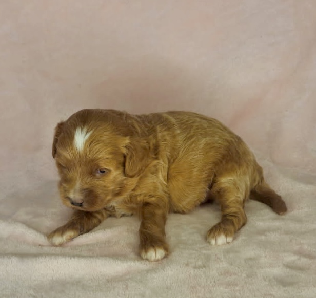 Smelt is from our Tannehill themed F1bb generation litter. A quick tour of the Tannehill park museum will explain her nick name! She is a red mini Goldendoodle girl with a wavy coat and pretty white markings on each foot and her head. Both parents of this litter have two dominant furnishings so they are all great choices for allergy sufferers and will not shed. They were born February 10th and 8 weeks old April 7th.