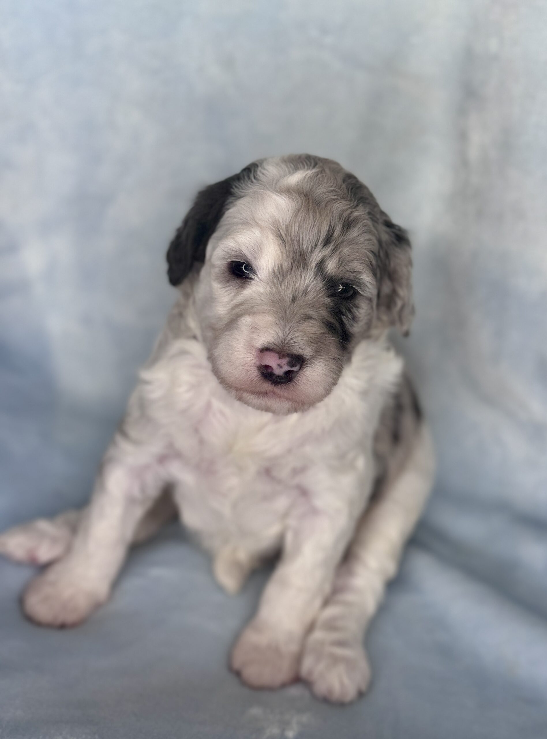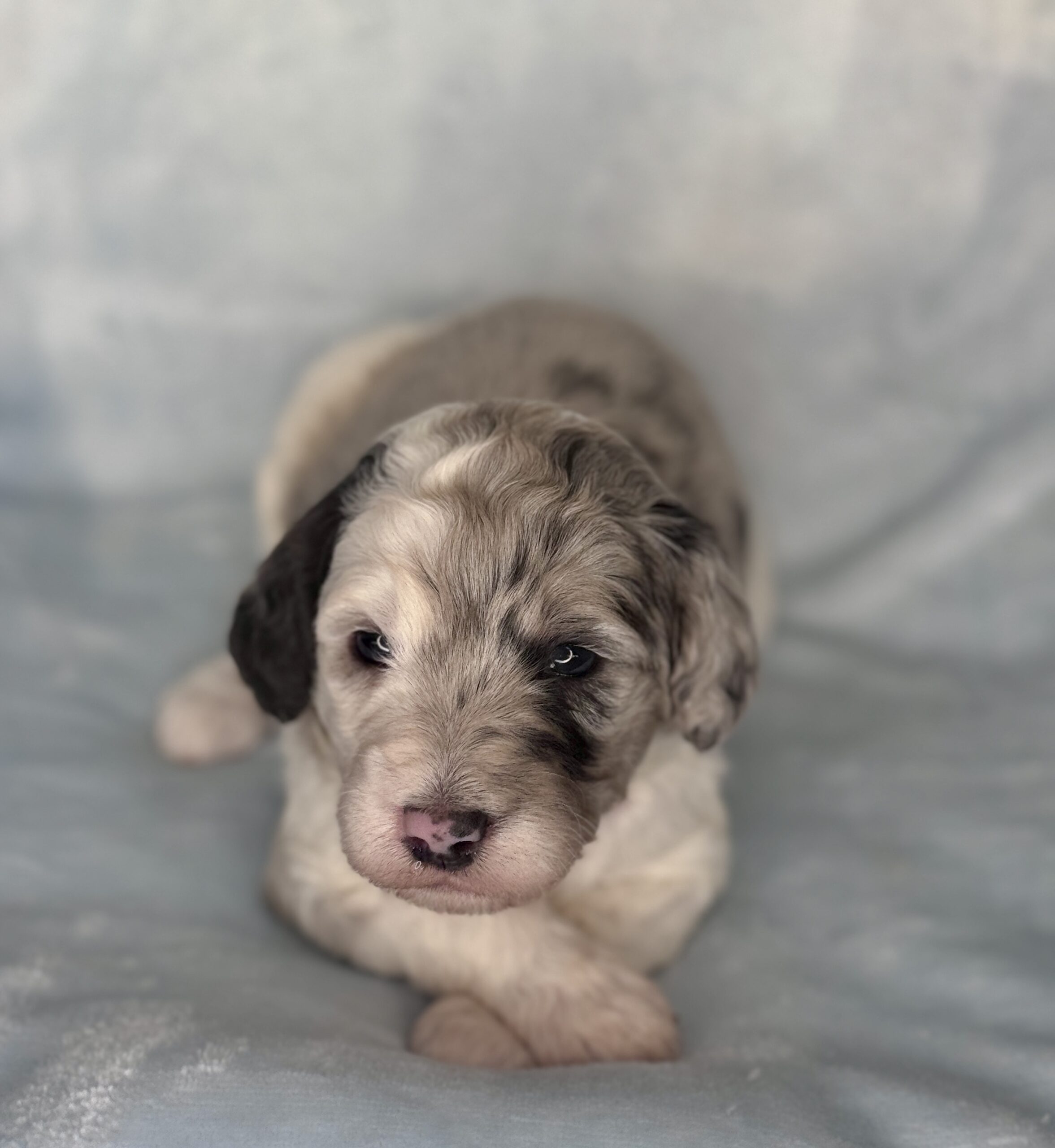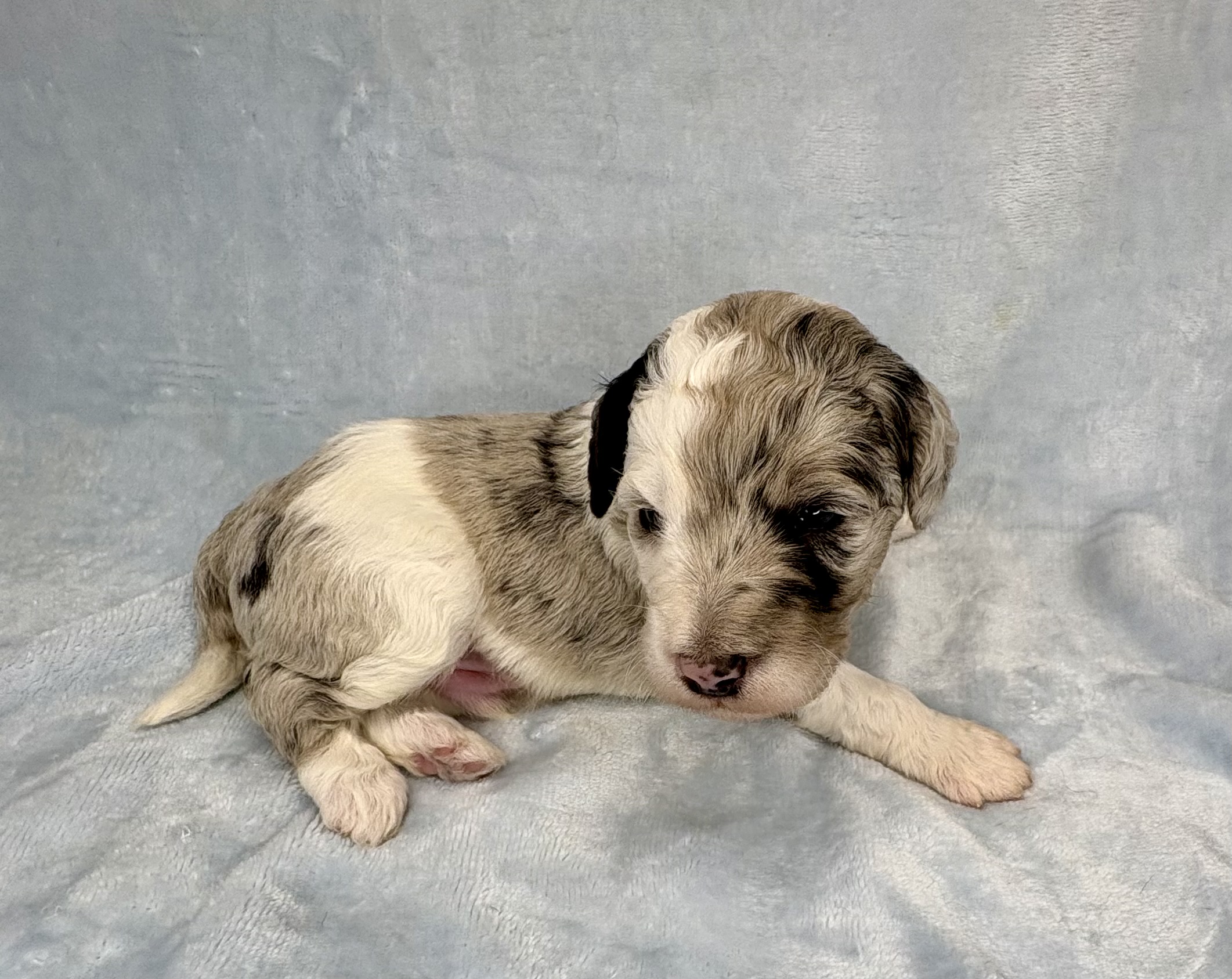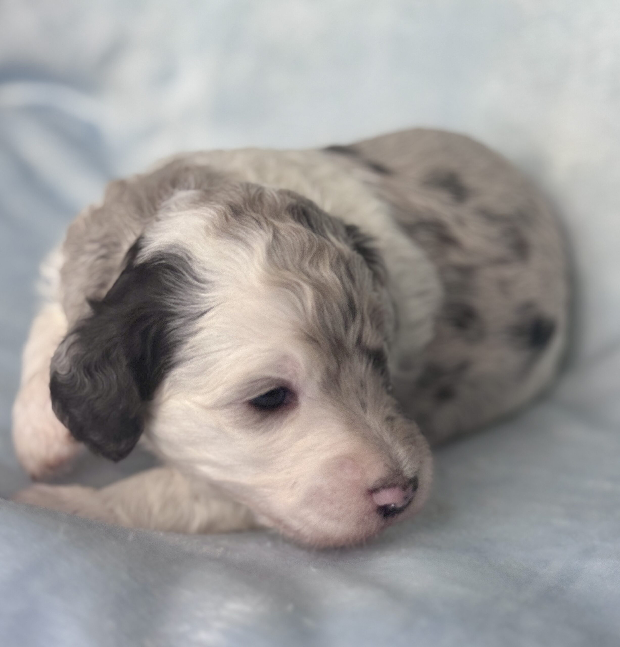 Sparkles is from our New Years litter. He is a blue merle parti color. I do love that little black ear! All of the puppies in this litter will have that classic doodle wavy coat that is non-shedding. They were born November 4th.