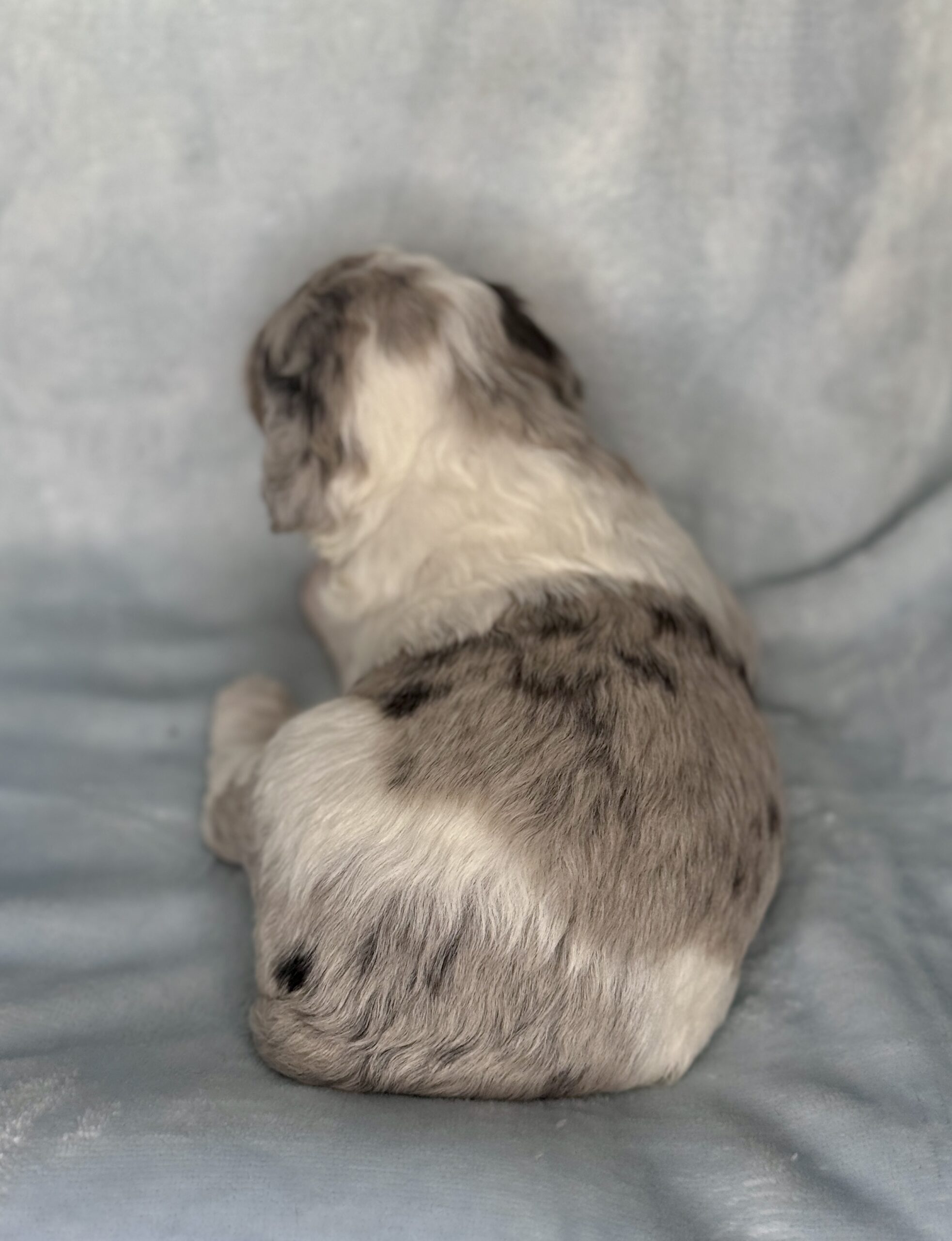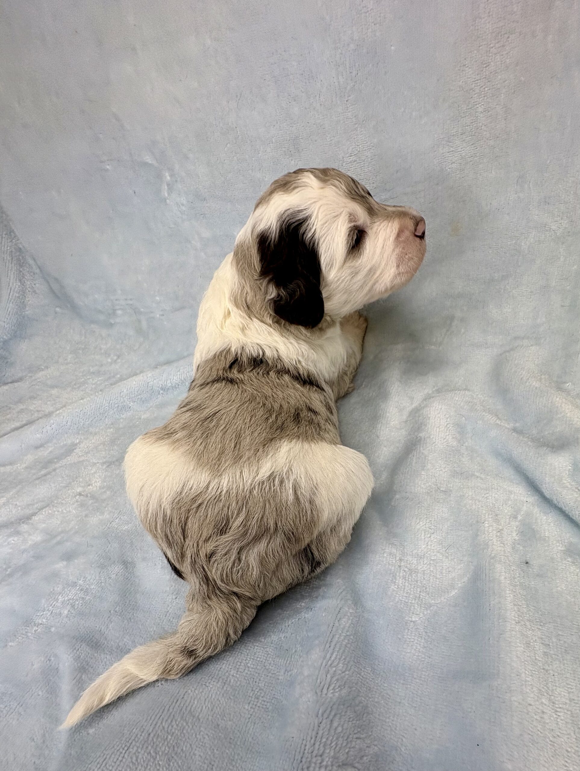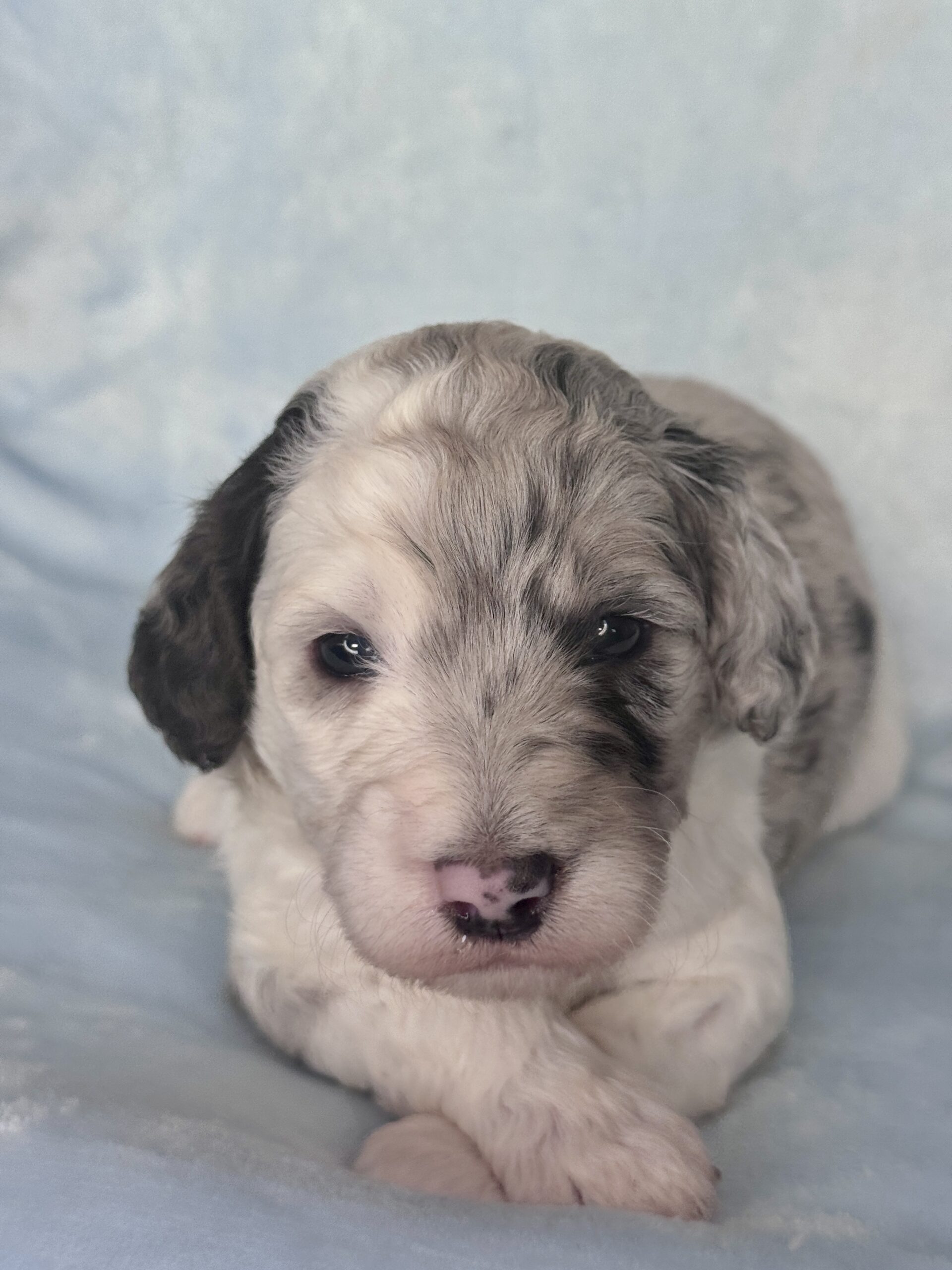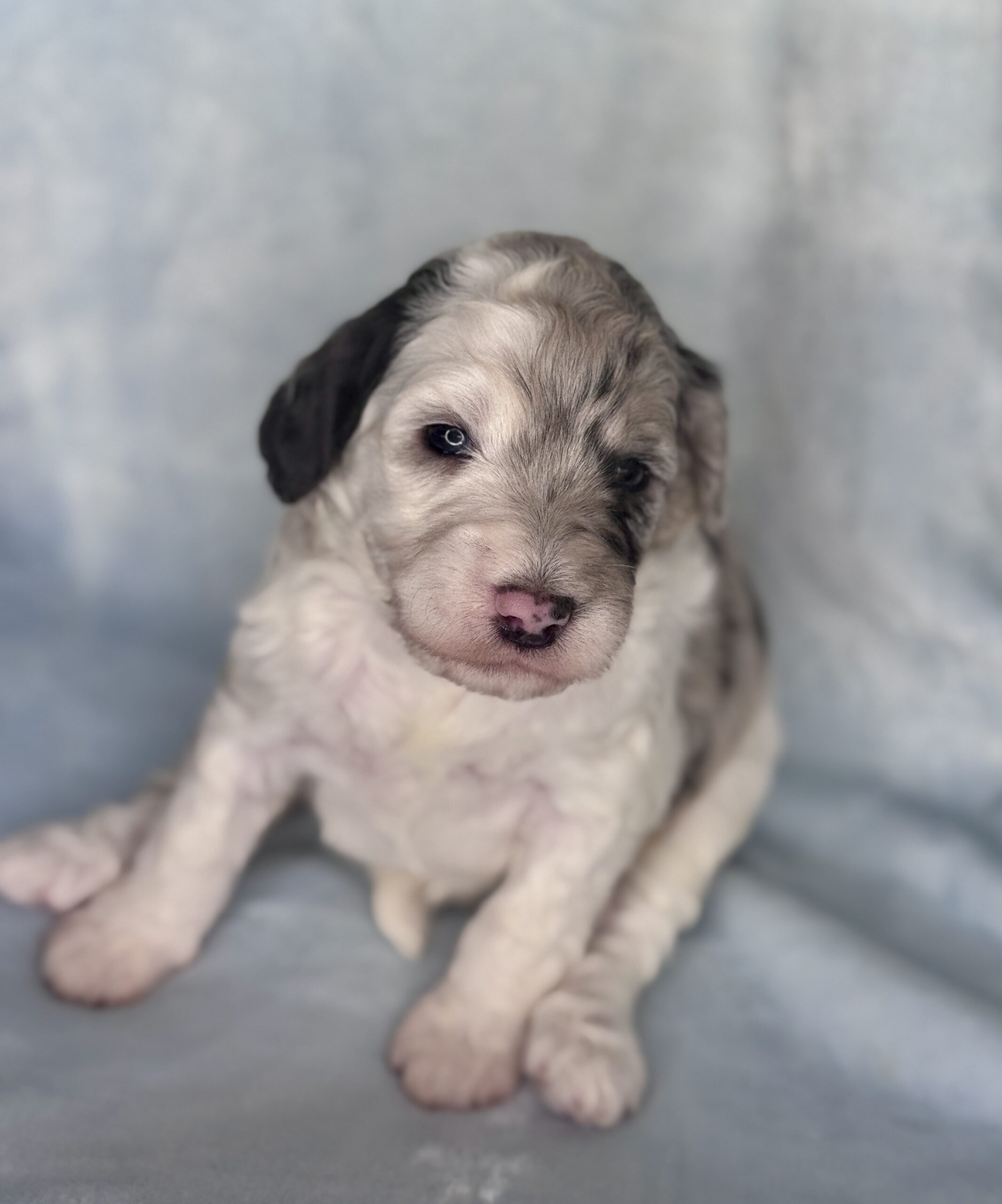Sparkles is from our New Years litter. He is a blue merle parti color. I do love that little black ear! All of the puppies in this litter will have that classic doodle wavy coat that is non-shedding. They were born November 4th.