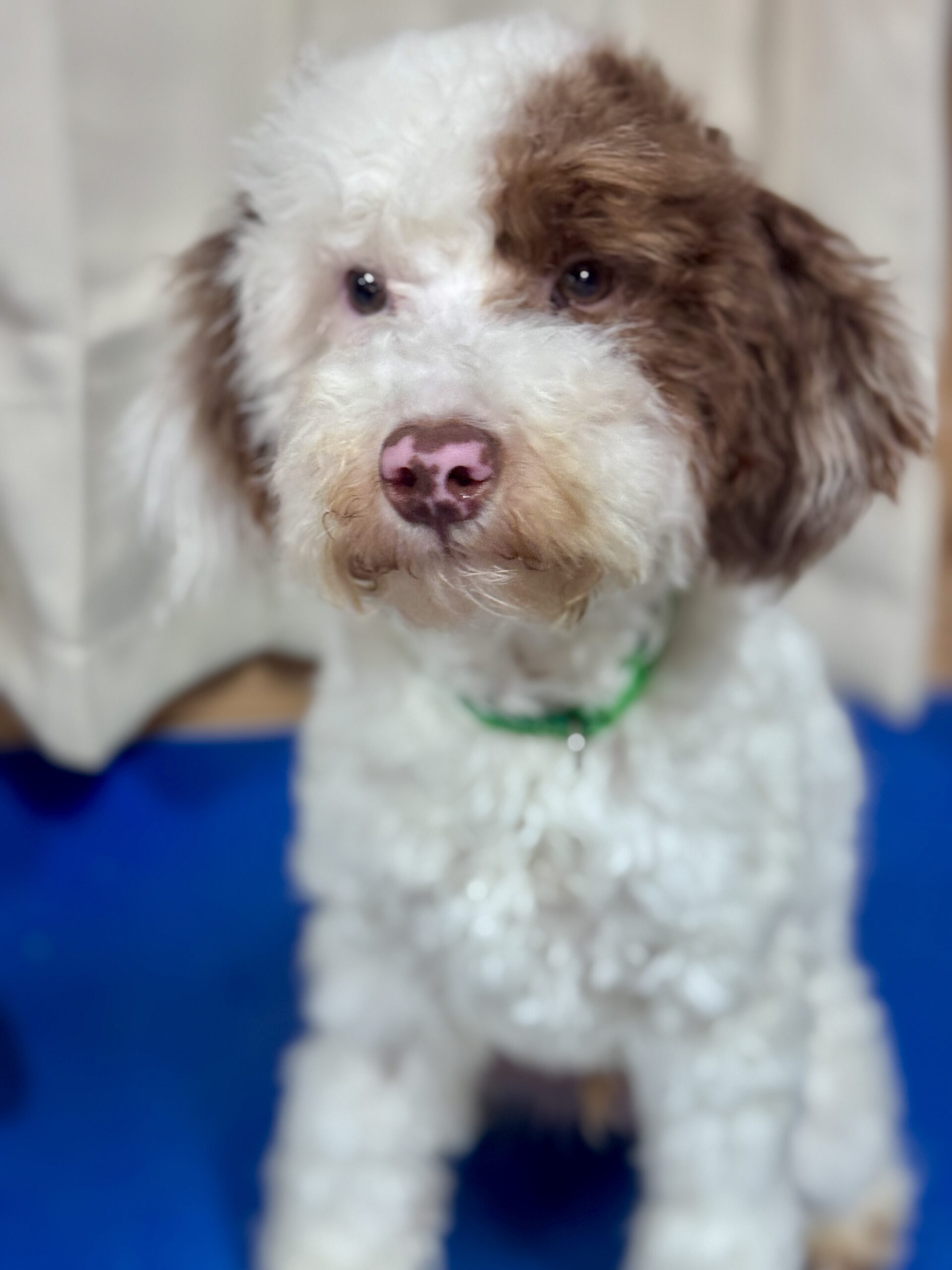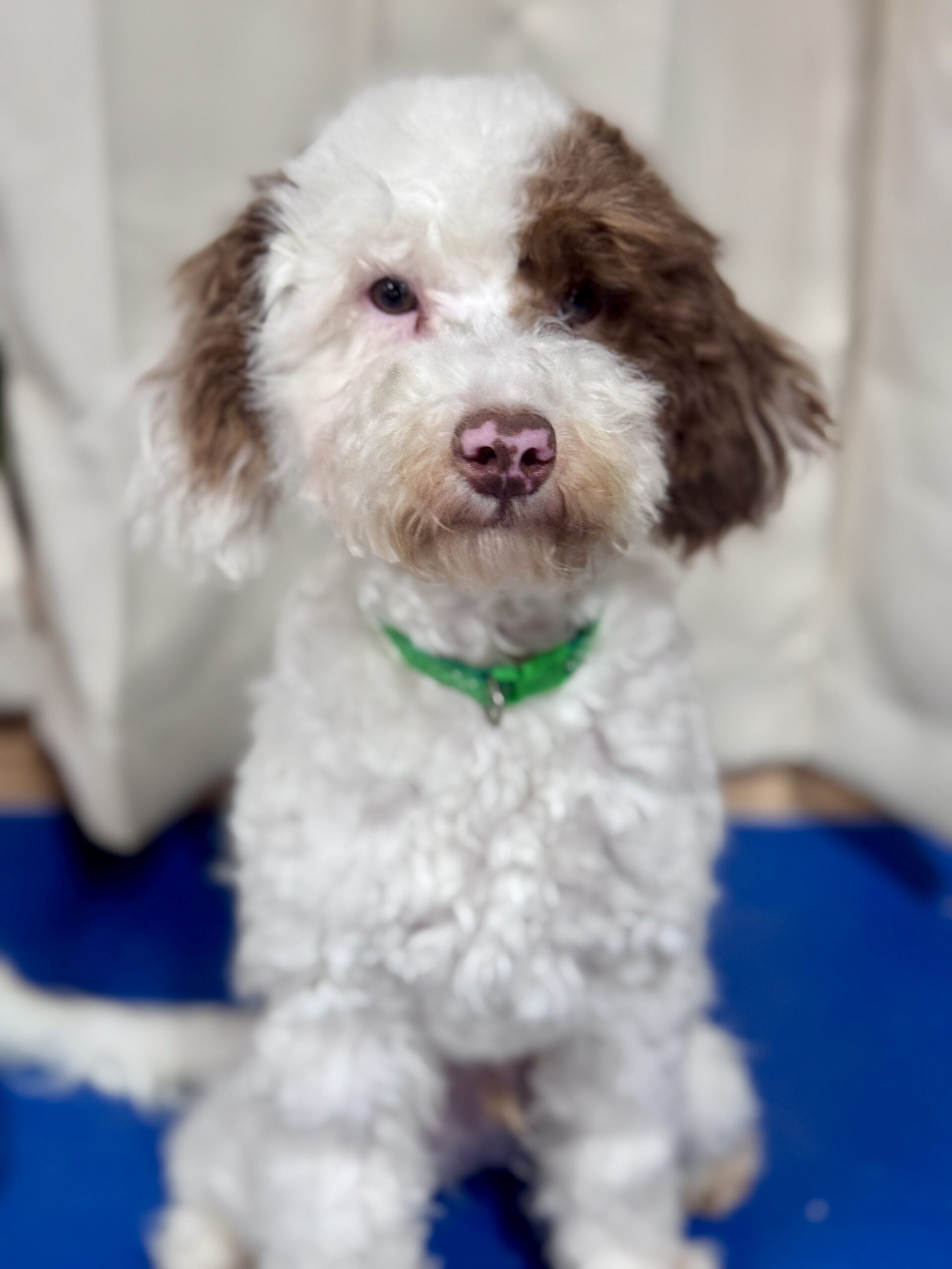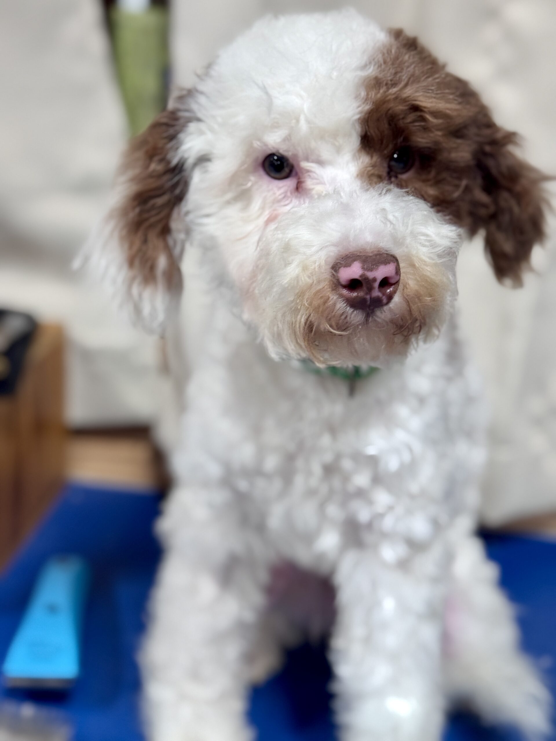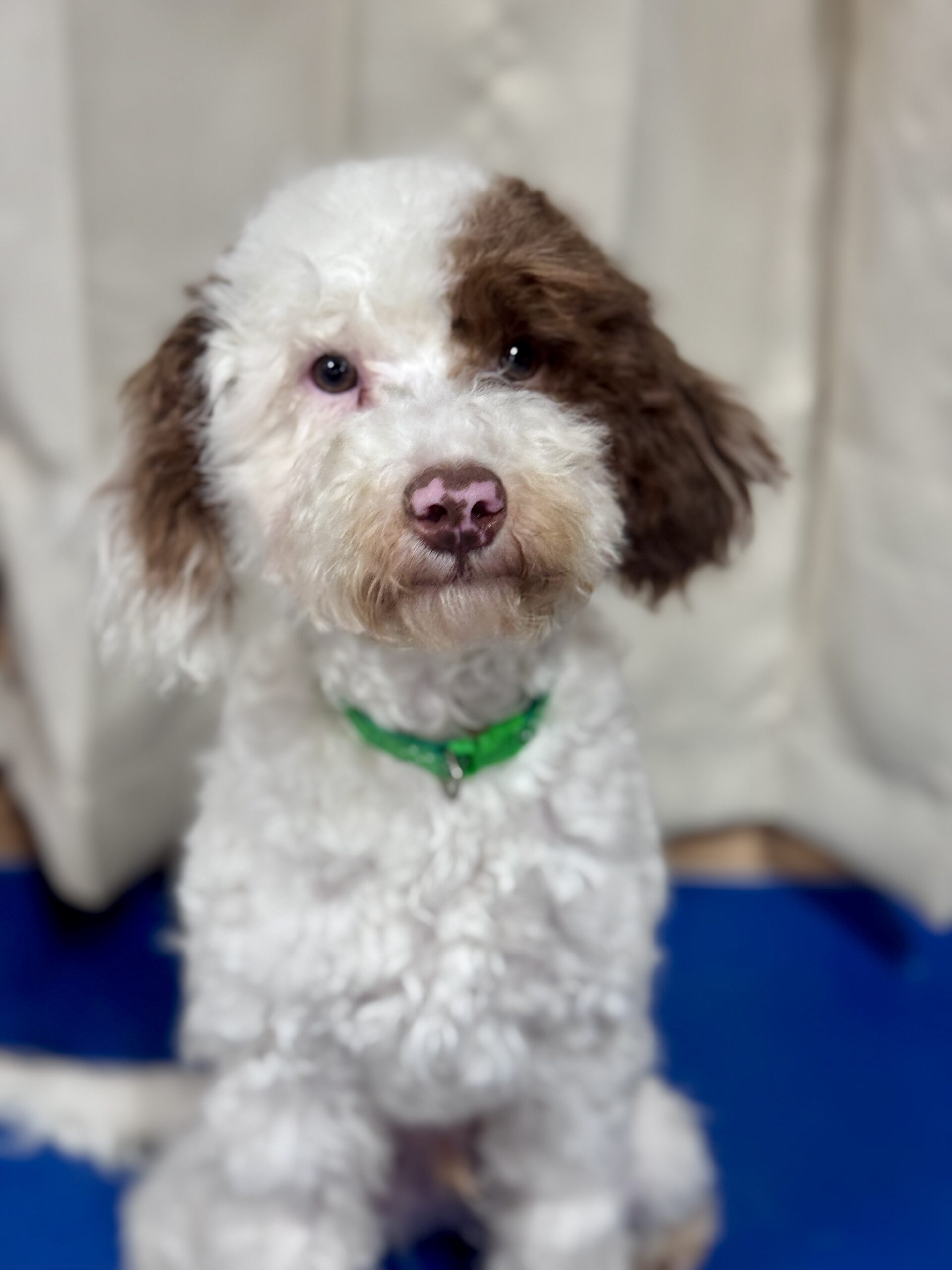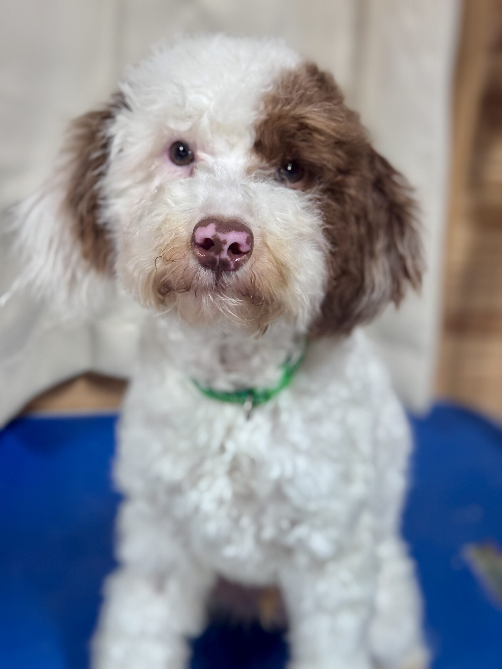 Sunny is from our “Summer Sun” litter.  He is a chocolate parti which means he’s  white with brown spots.  His nose color has filled in quite a bit and he is such a sweetheart!  Just a fluffy little cotton ball.  He would be a great choice for allergy sufferer because he has two dominant furnishings and will not shed.   His curly coat will help as well…and is super soft to pet.  He is little guy and will be about 18-20 pounds as an adult.  Born May 30th and is now fully vaccinated and neutered.  He is easily groomed and handled…doesn’t even mind his nails being trimmed.  He will soon be a “trained puppy” at a higher price but he already knows quite a few things.