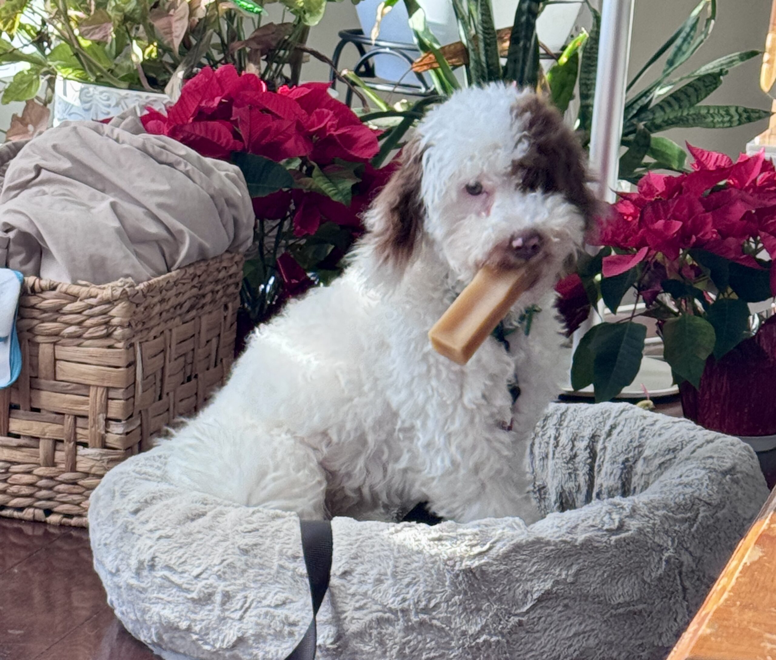 Sunny is from our “Summer Sun” litter. He is a chocolate parti which means he’s white with brown spots. His nose color has filled in quite a bit and he is such a sweetheart! Just a fluffy little cotton ball. He would be a great choice for allergy sufferer because he has two dominant furnishings and will not shed. His curly coat will help as well…and is super soft to pet. He is little guy and will be about 18-20 pounds as an adult. Born May 30th and is now fully vaccinated and neutered. He is easily groomed and handled…doesn’t even mind his nails being trimmed. He will soon be a “trained puppy” at a higher price but he already knows quite a few things.