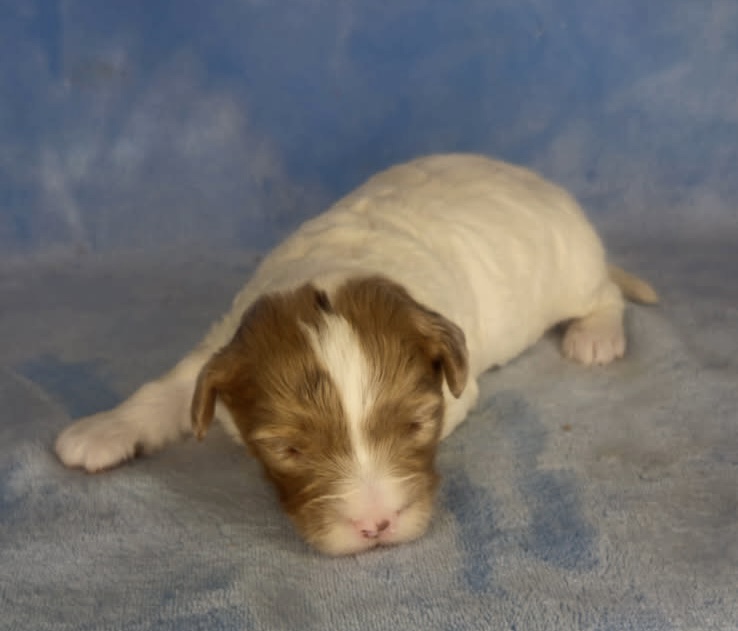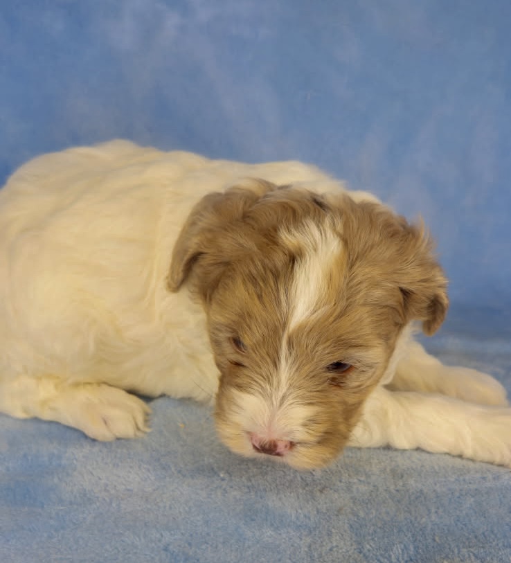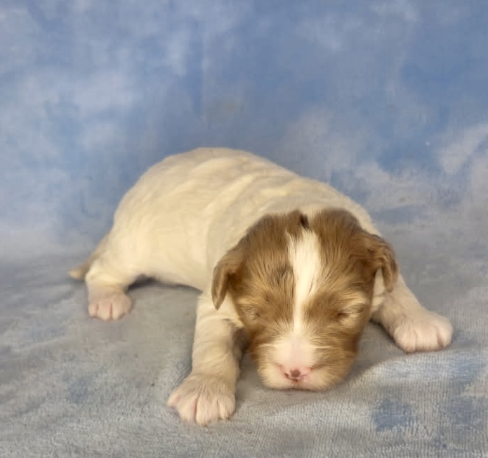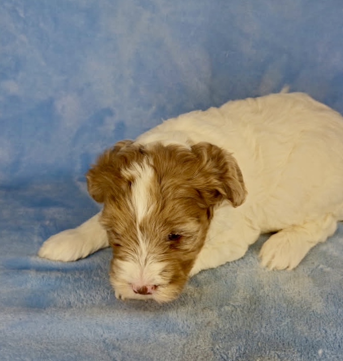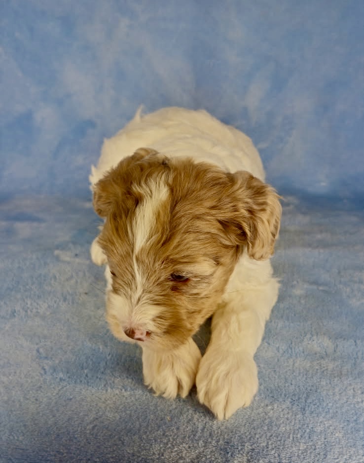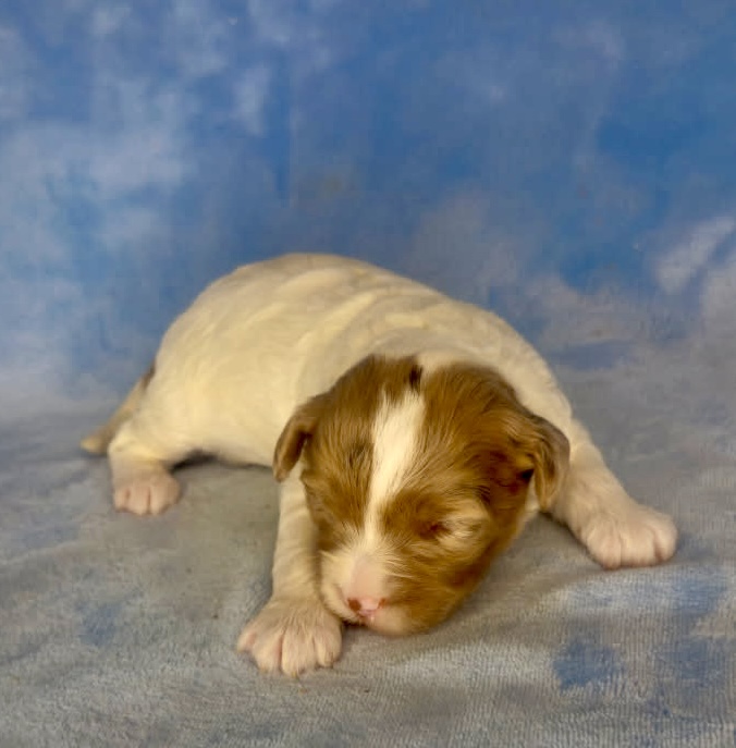 Jasmine and Jarad have tiny puppies that have matured in the past from 11-19 pounds. They are considered micro mini goldendoodles. The litter was born March 9th and would be 8 weeks May 4th. We can have both curly and wavy coats in this litter. Tex-Mex has a wavy coat and is a neat chocolate merle parti color.