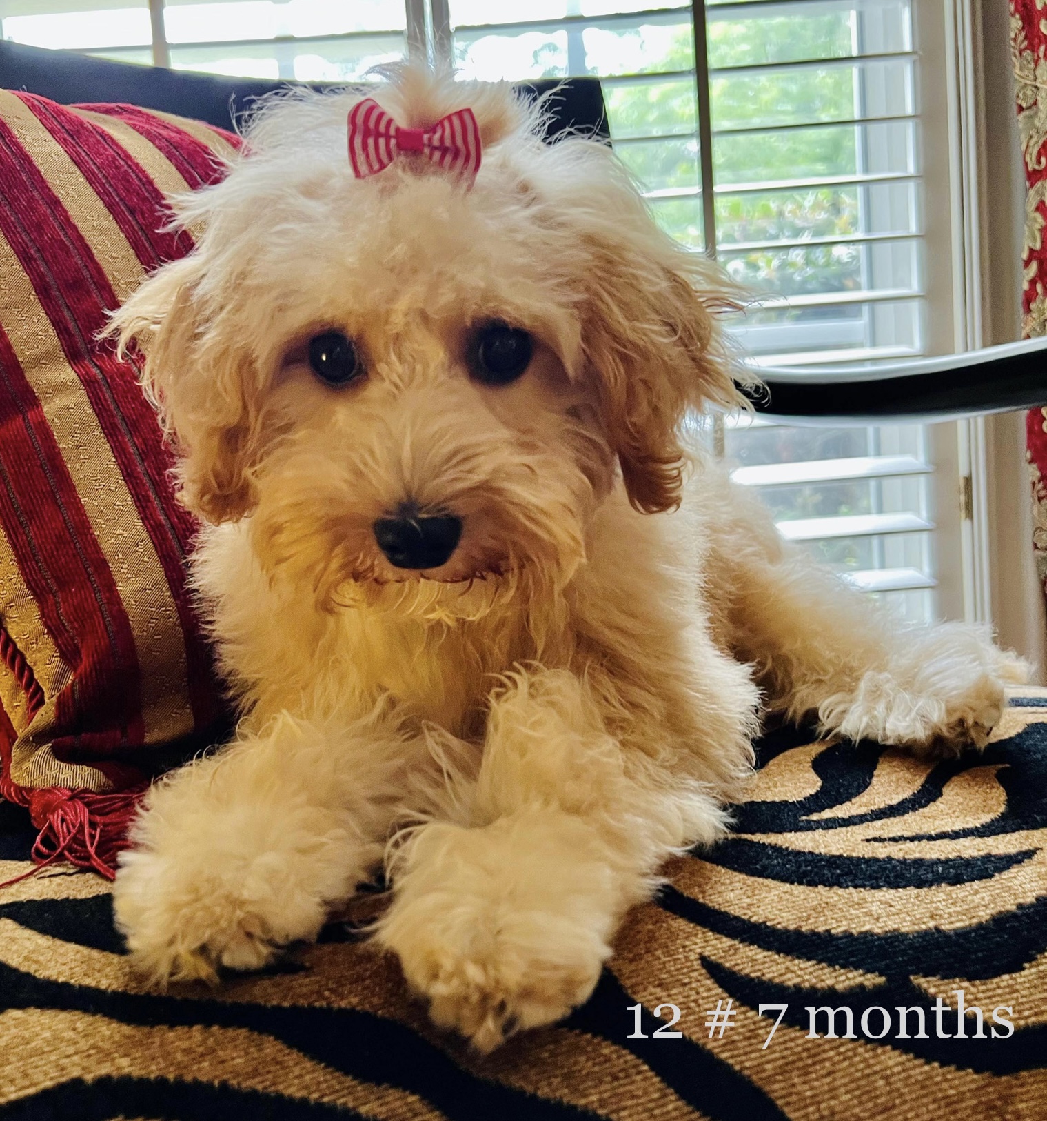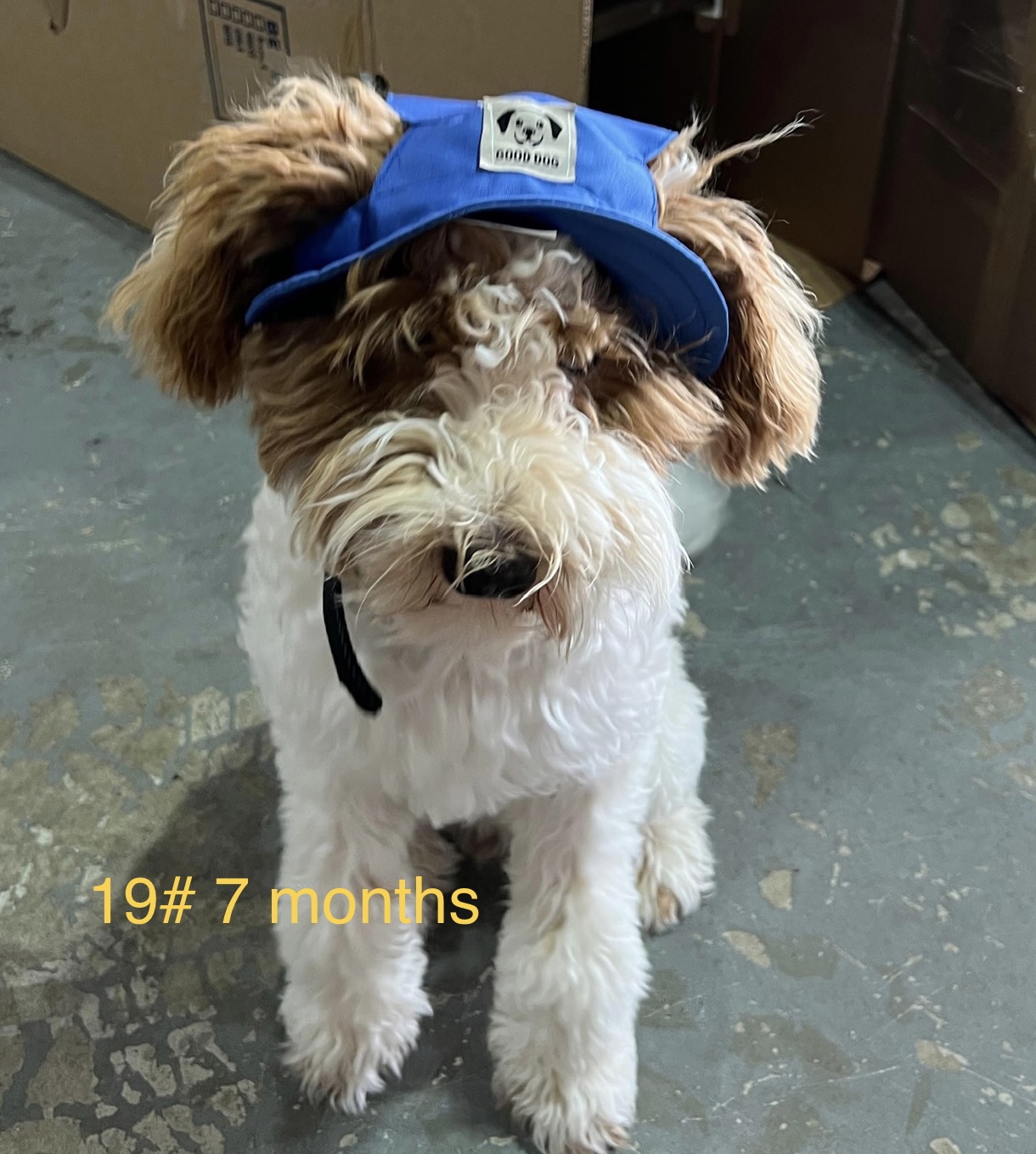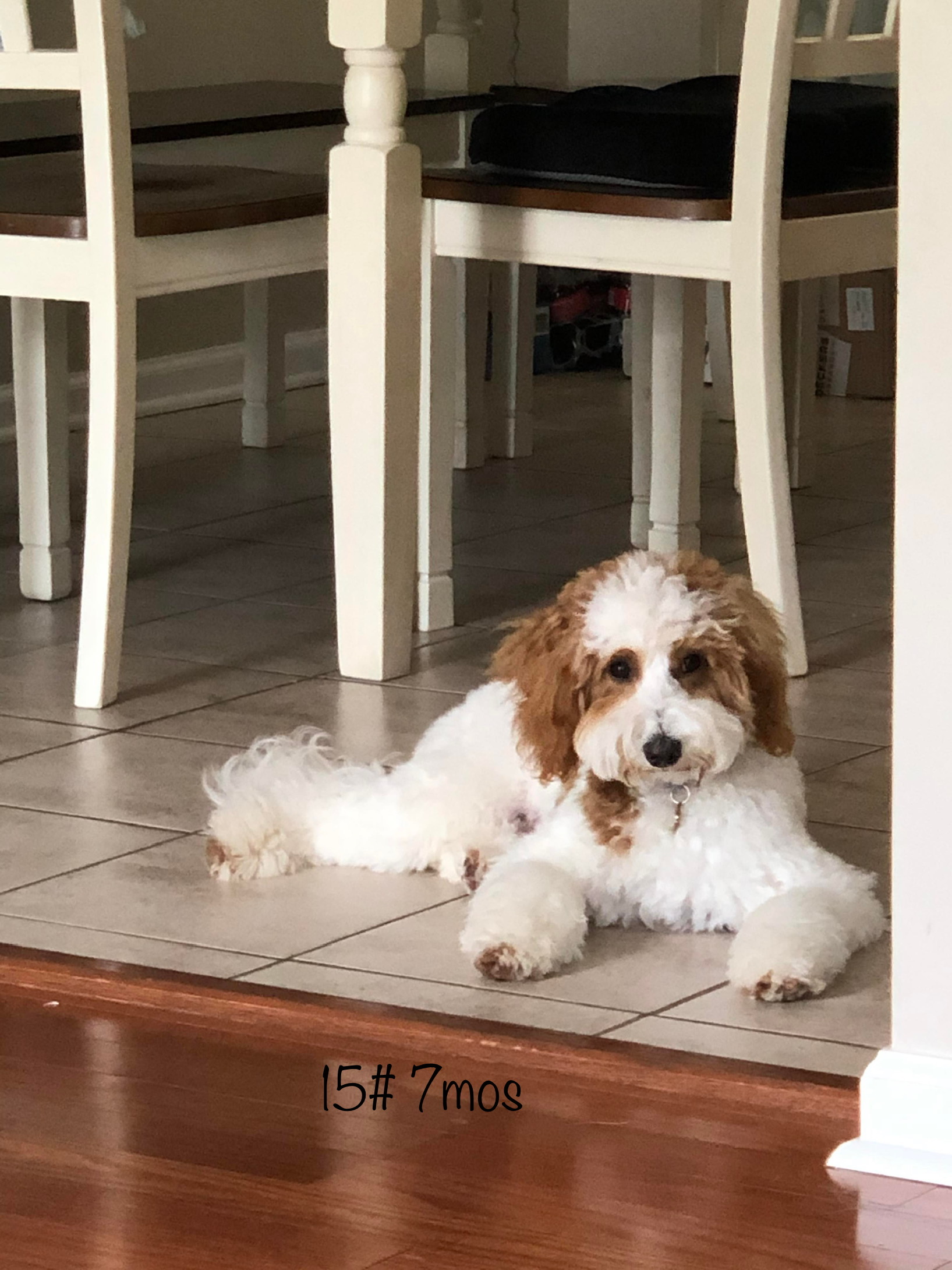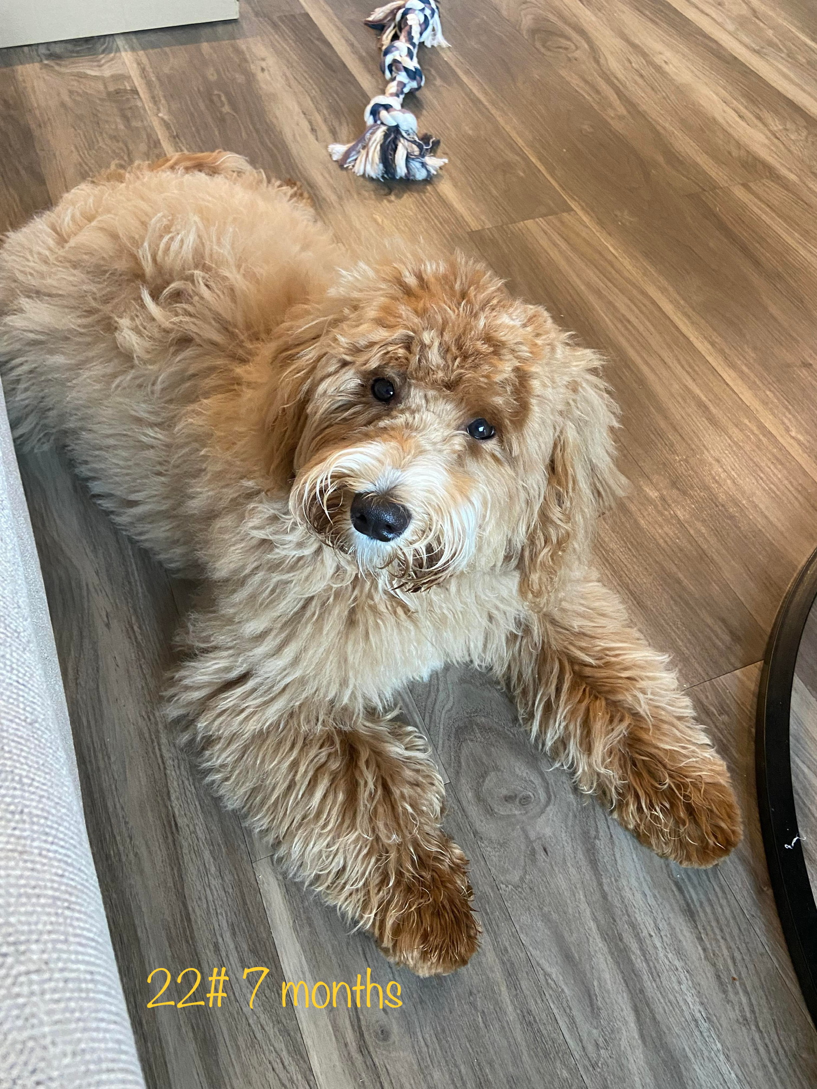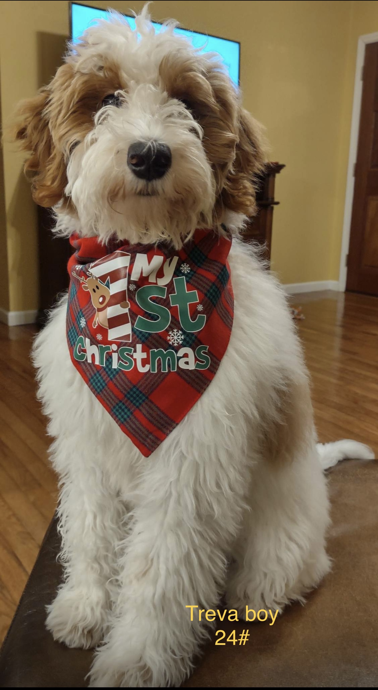 Treva is one of those 7 daughters of our favorite mom “Bailey”. We kept so many of her daughters in our program over the years because they are attentive to their owners and easily trained. Treva is no exception and is a sweet girl. She is about 28 pounds with a curly coat. She is also high intensity red with 9 out of 10 markers.