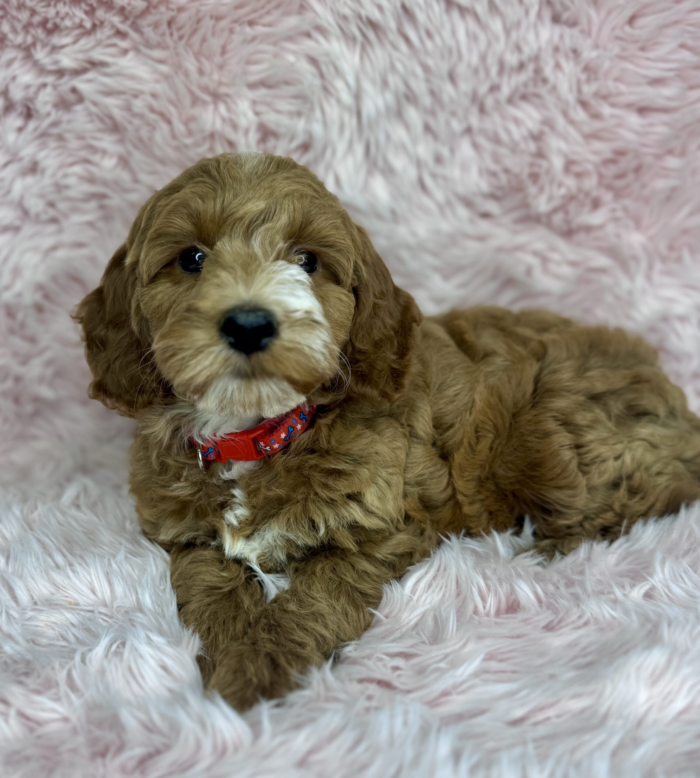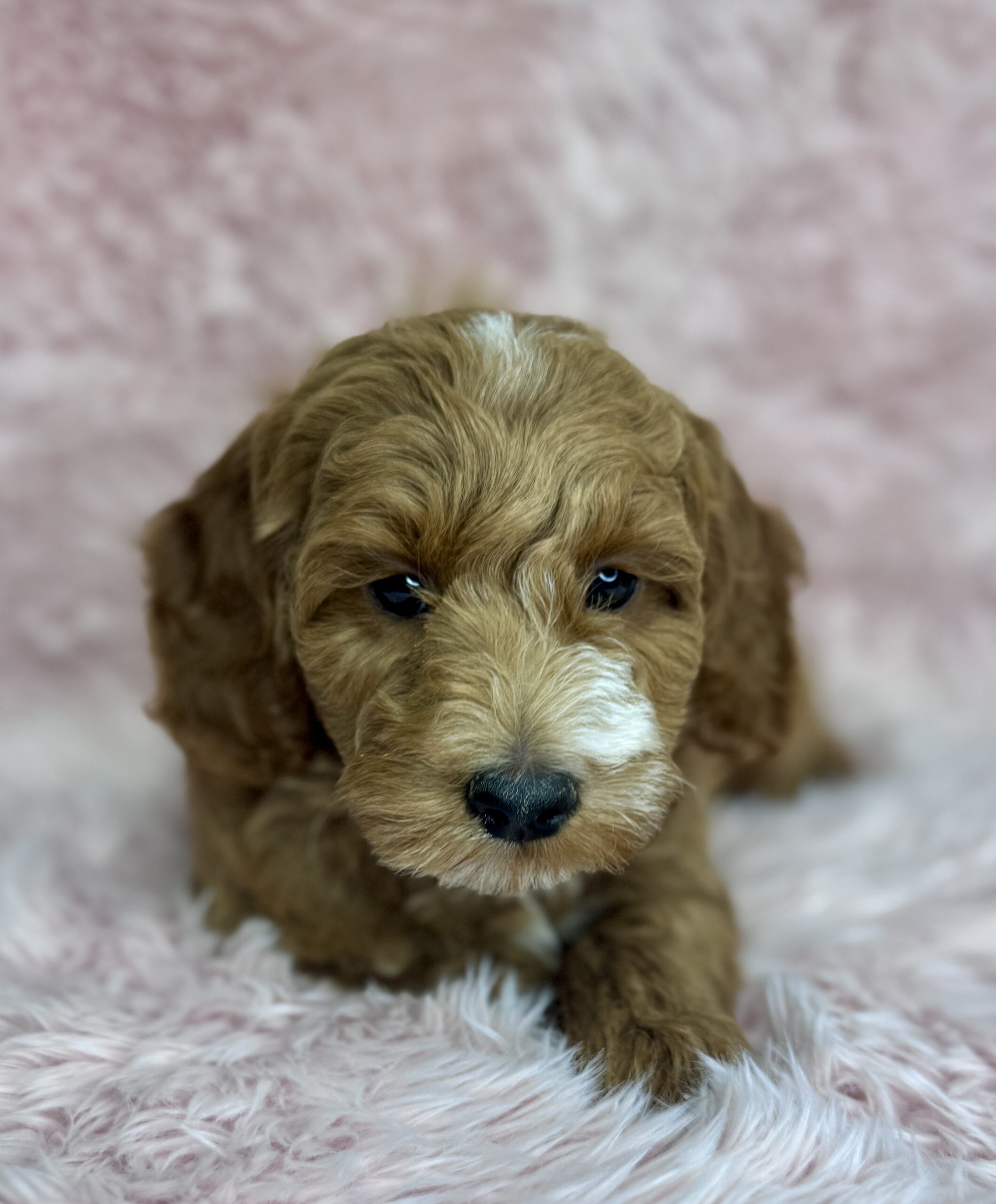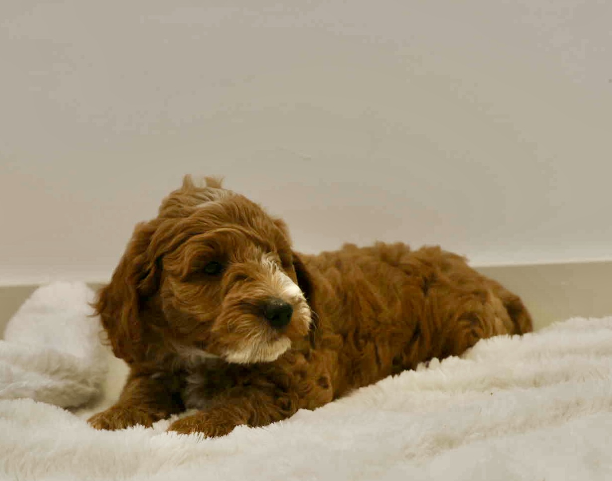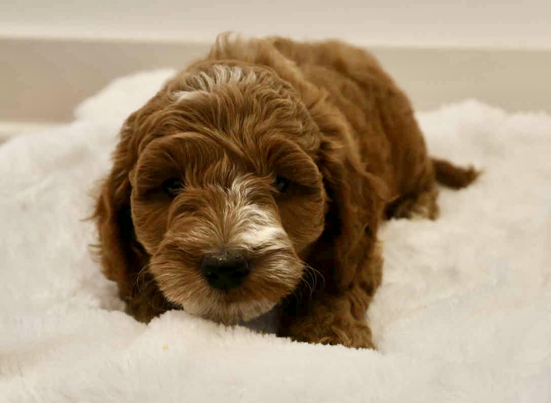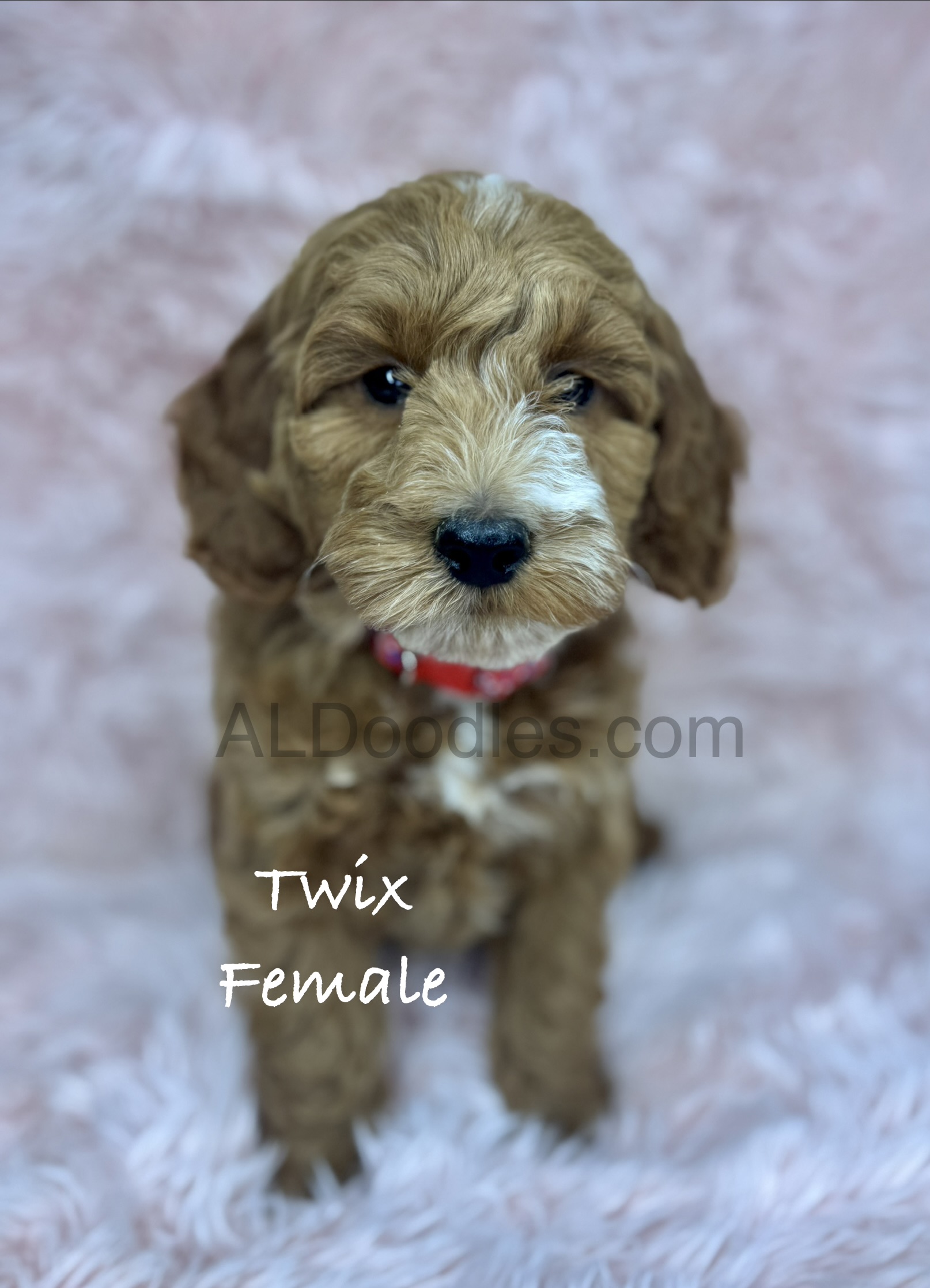 This is a really pretty litter of mini goldendoodles that are dark red, with lots of white trim.  Some of the puppies are tuxedo pattern which means white on the face, chest and feet.  Born August 27th they are now ready for new homes just before Halloween.  They are named after all of the favorite Halloween candies.
