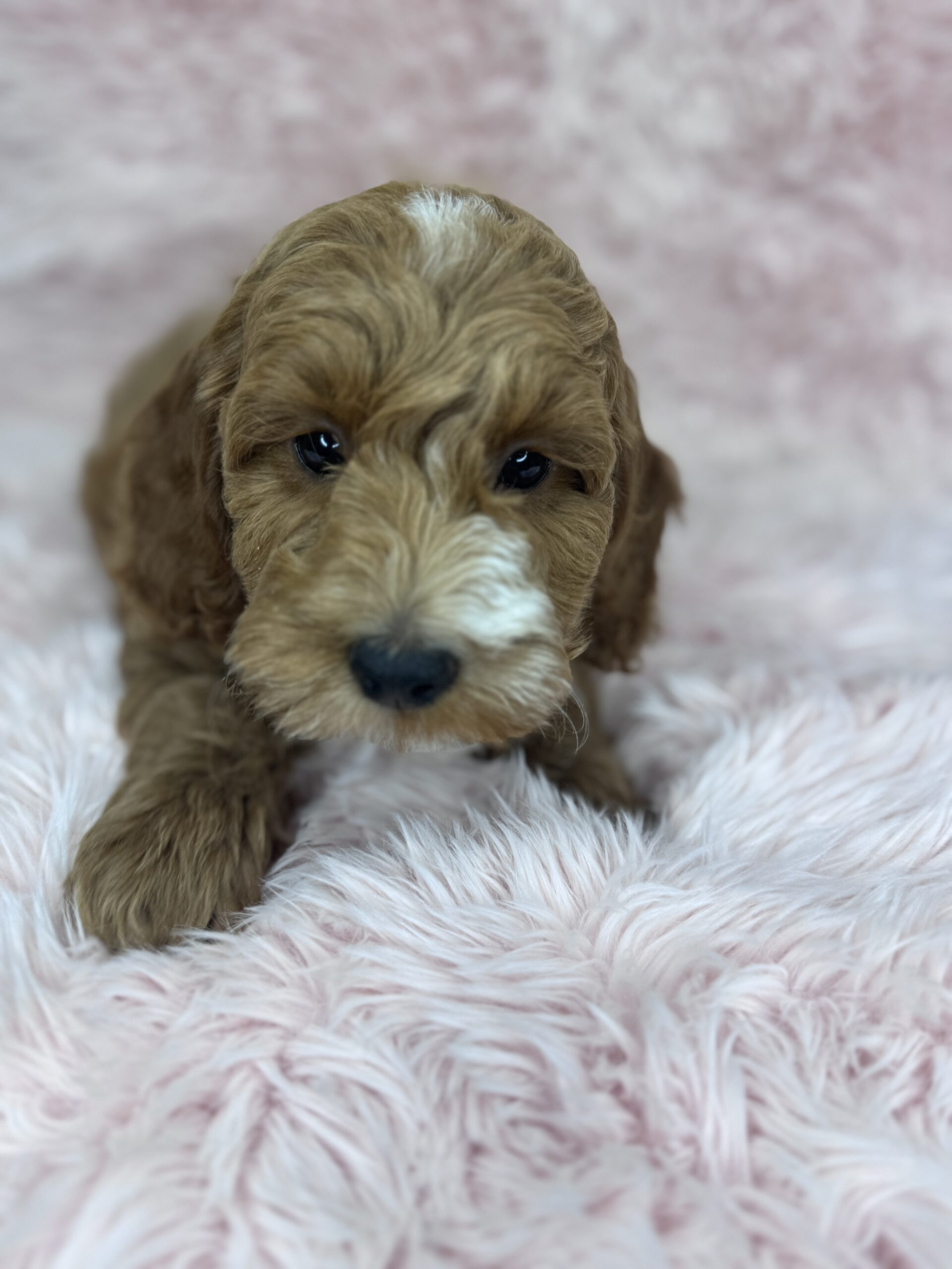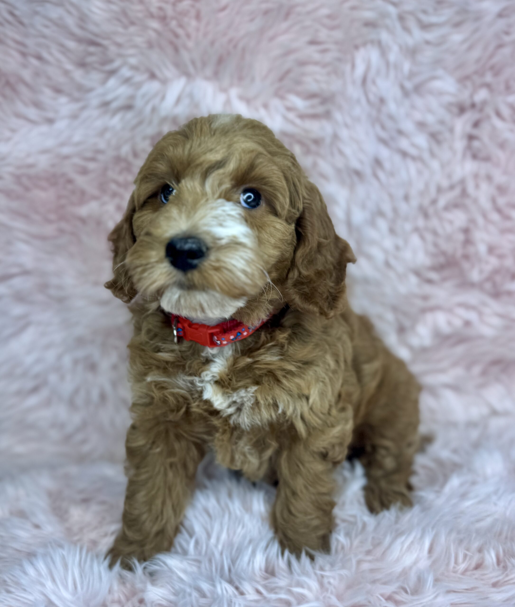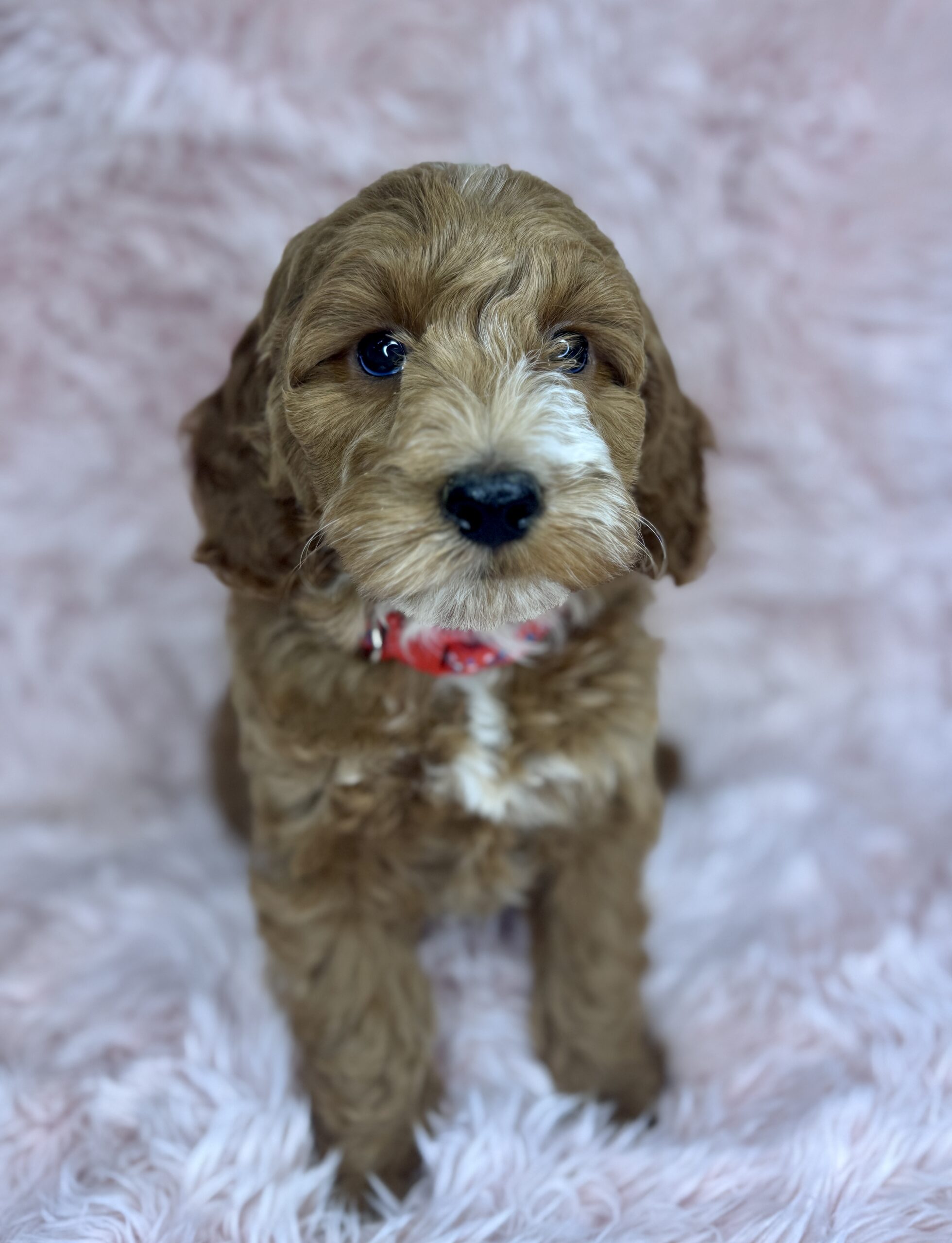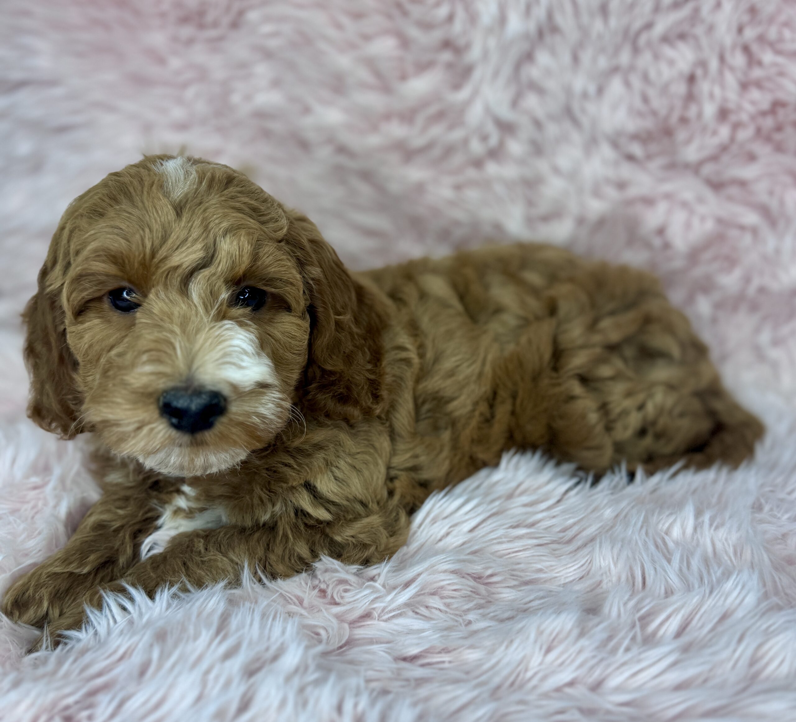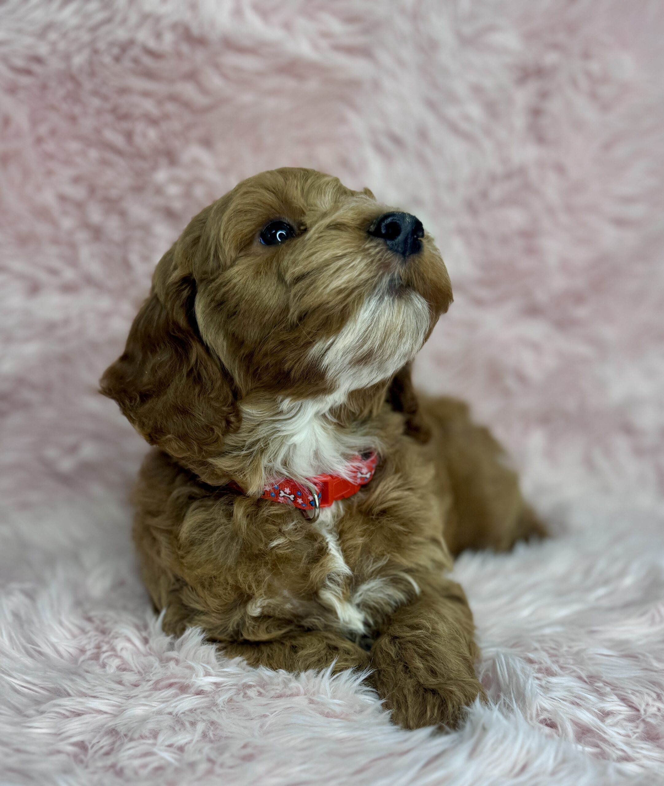 This is a really pretty litter of mini goldendoodles that are dark red, with lots of white trim.  Some of the puppies are tuxedo pattern which means white on the face, chest and feet.  Born August 27th they are now ready for new homes just before Halloween.  They are named after all of the favorite Halloween candies.