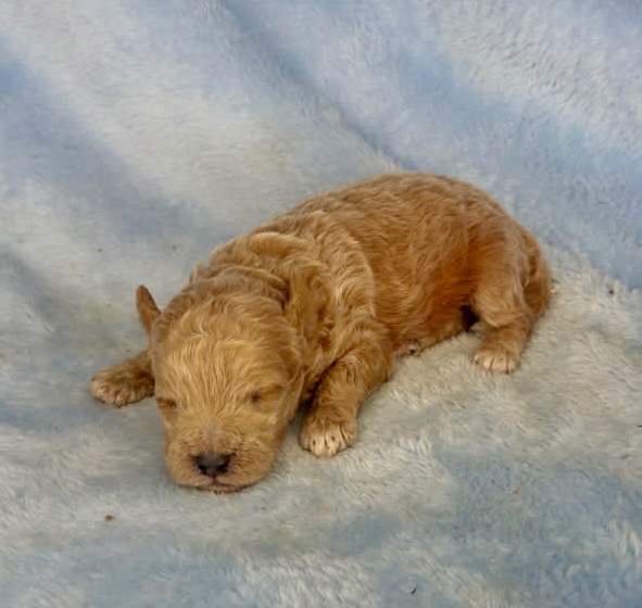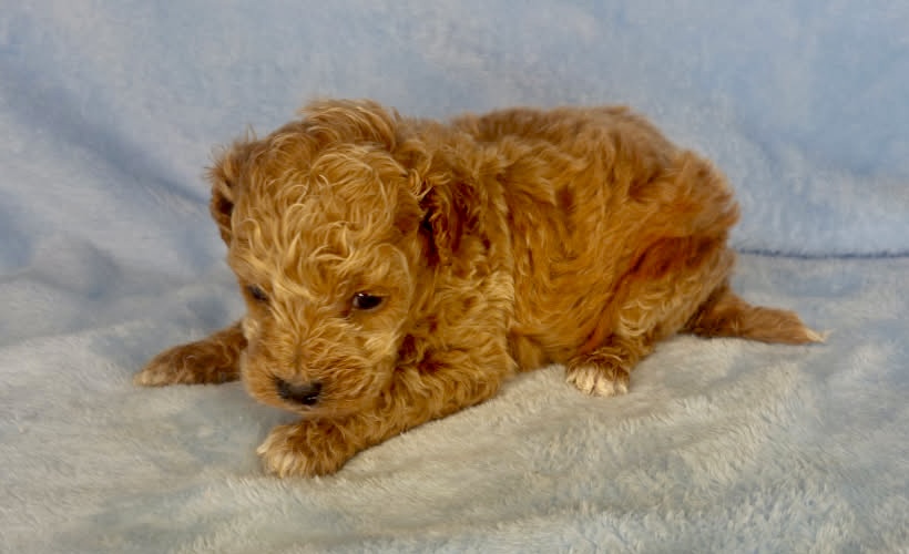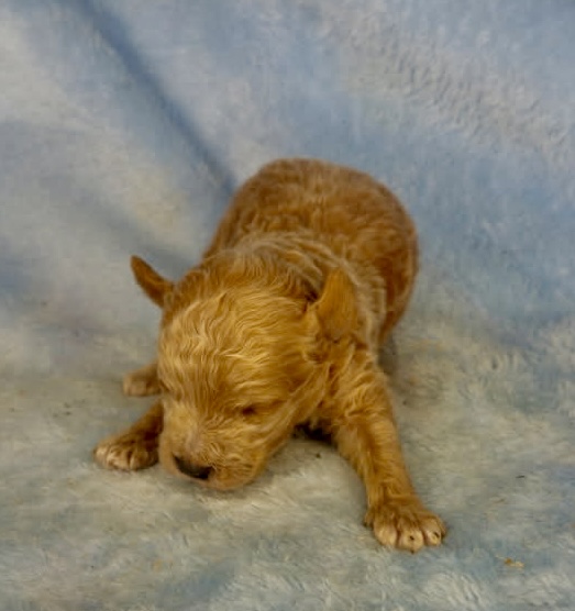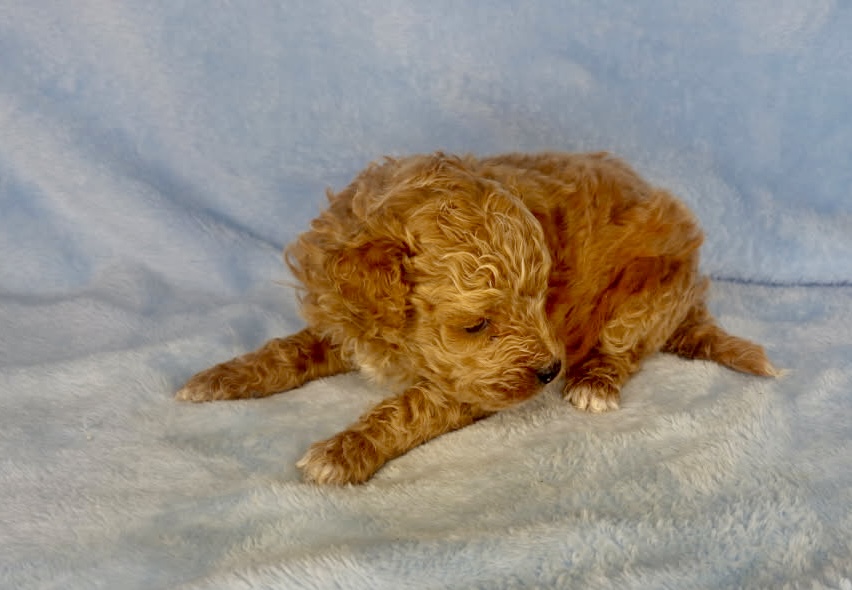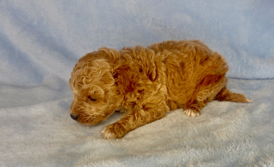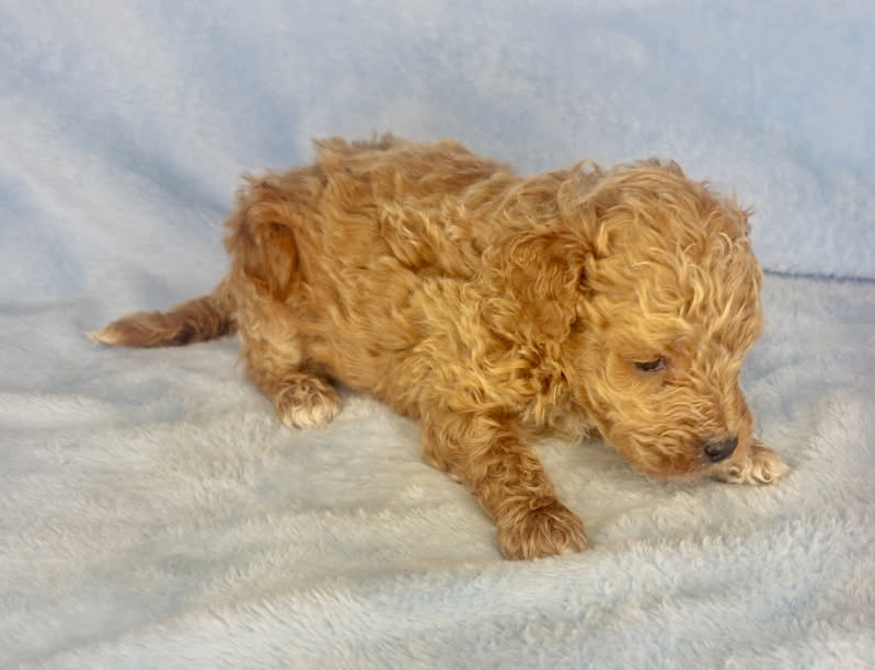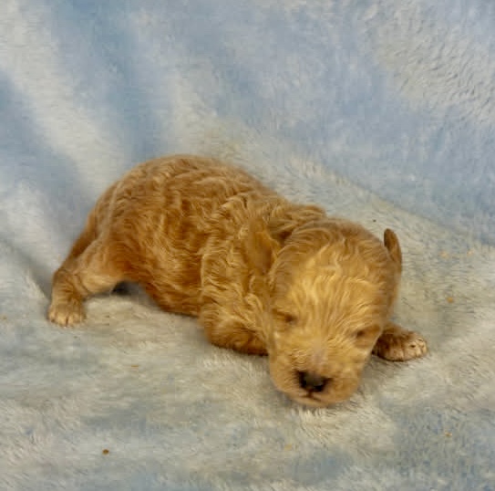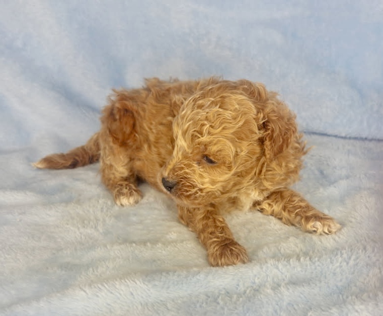 Watson is an apricot color micro-mini goldendoodle. Apricot is that honey carmel color that is classic for goldendoodles. He will look like a little teddy bear! These are F1bb goldendoodle puppies which means they have good odds of being non-shedding. They will all have curly coats and mature 12-15 pounds. Born December 6th and ready for new homes after our February 3rd vet appointment for exam, fecal and vaccinations.