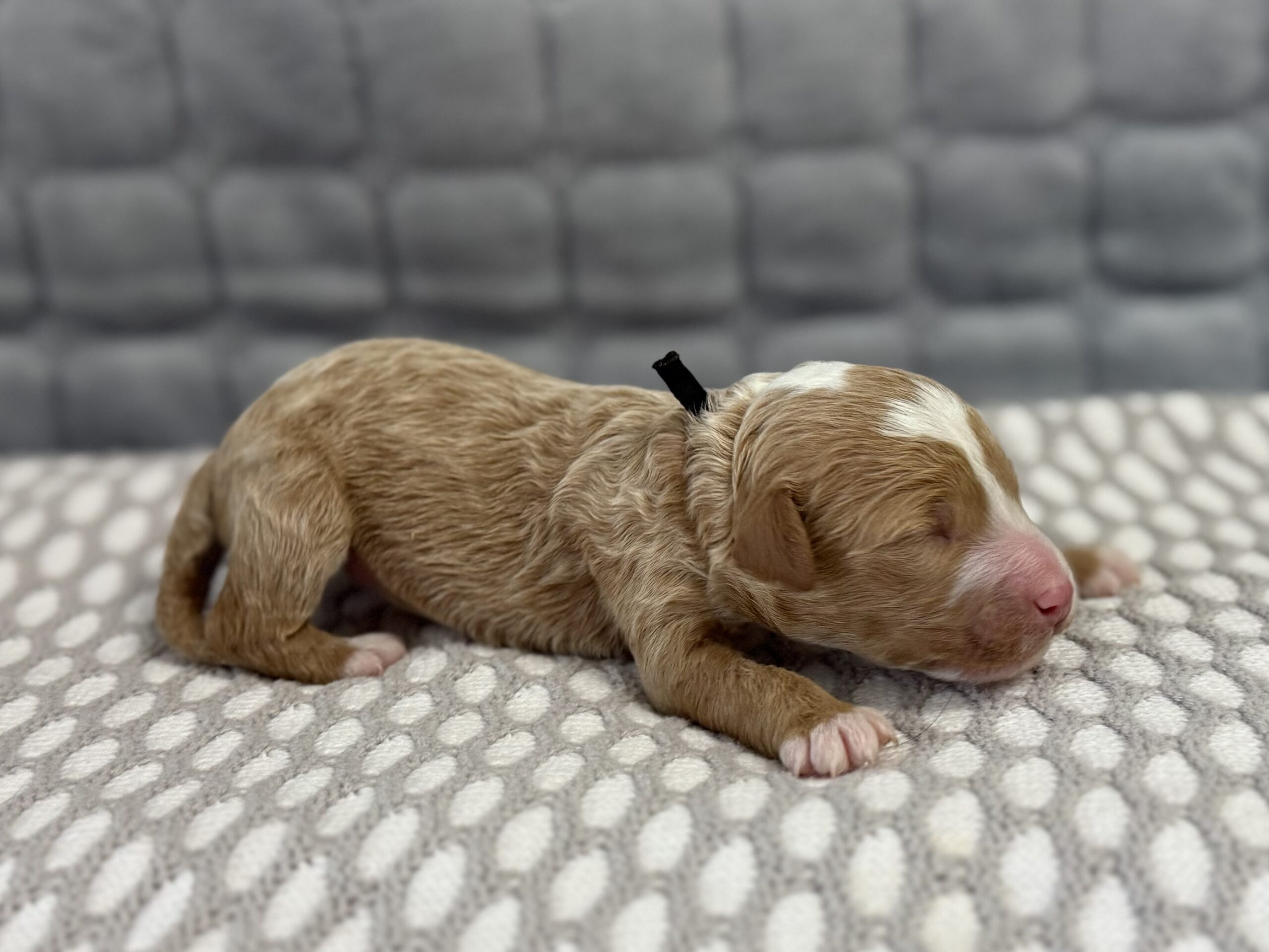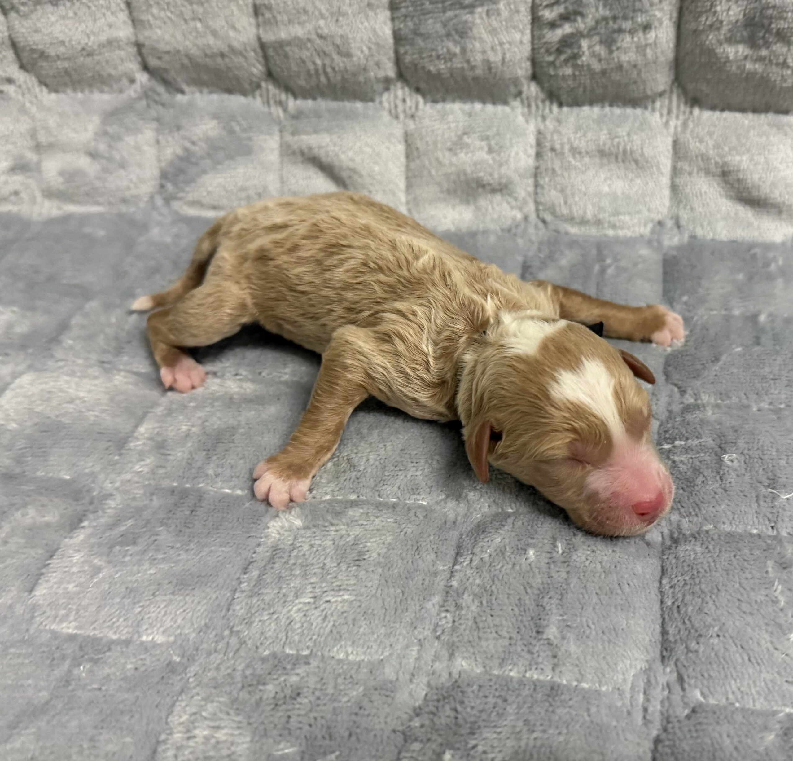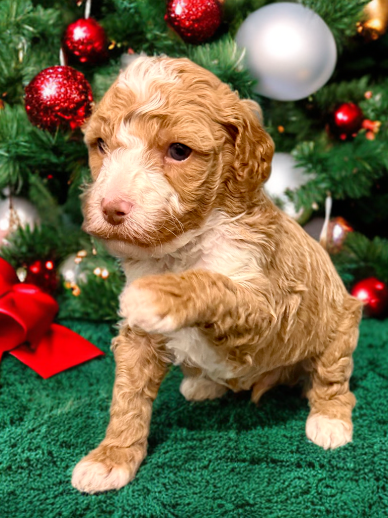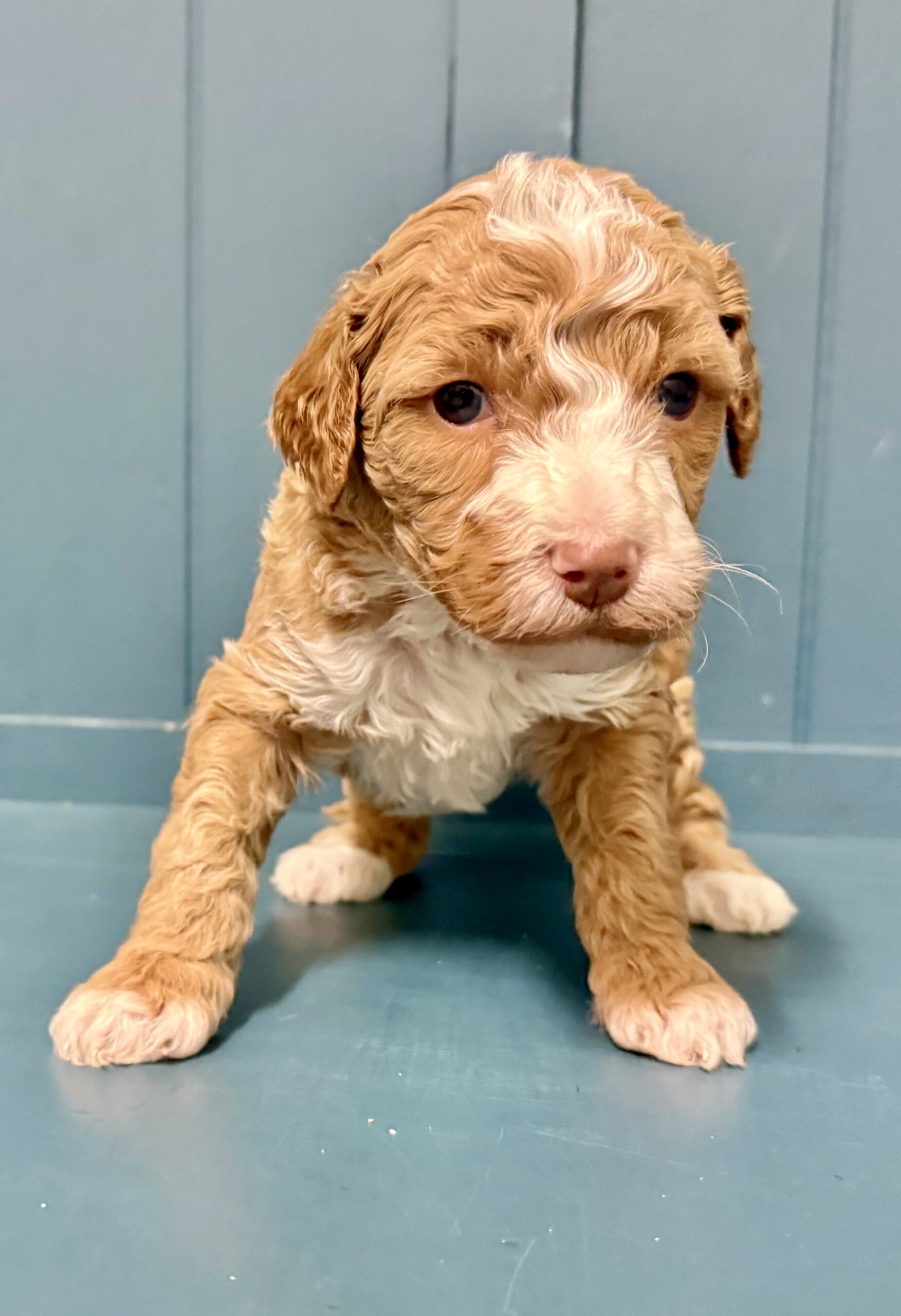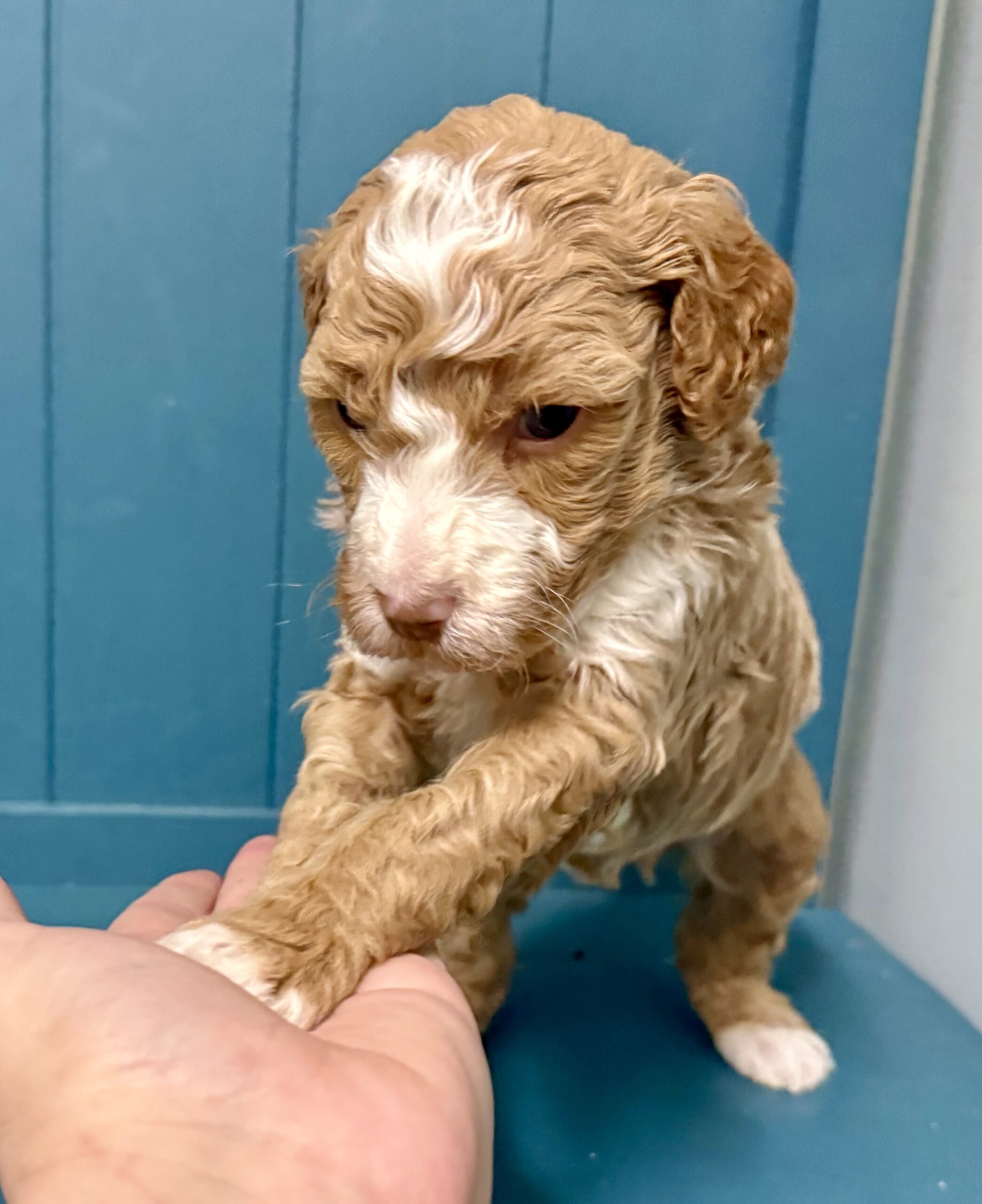 Zuma is from our Paw Patrol litter. He is an apricot color with a wavy coat currently but he likely will become darker red. We see that with these frosty looking pups. All of the puppies in this litter will be non-shedding. This litter was born November 18th and will be 8 weeks old January 13th. We will have a better idea as they grow but we expect them to be in the 20-25 range based on the parents.