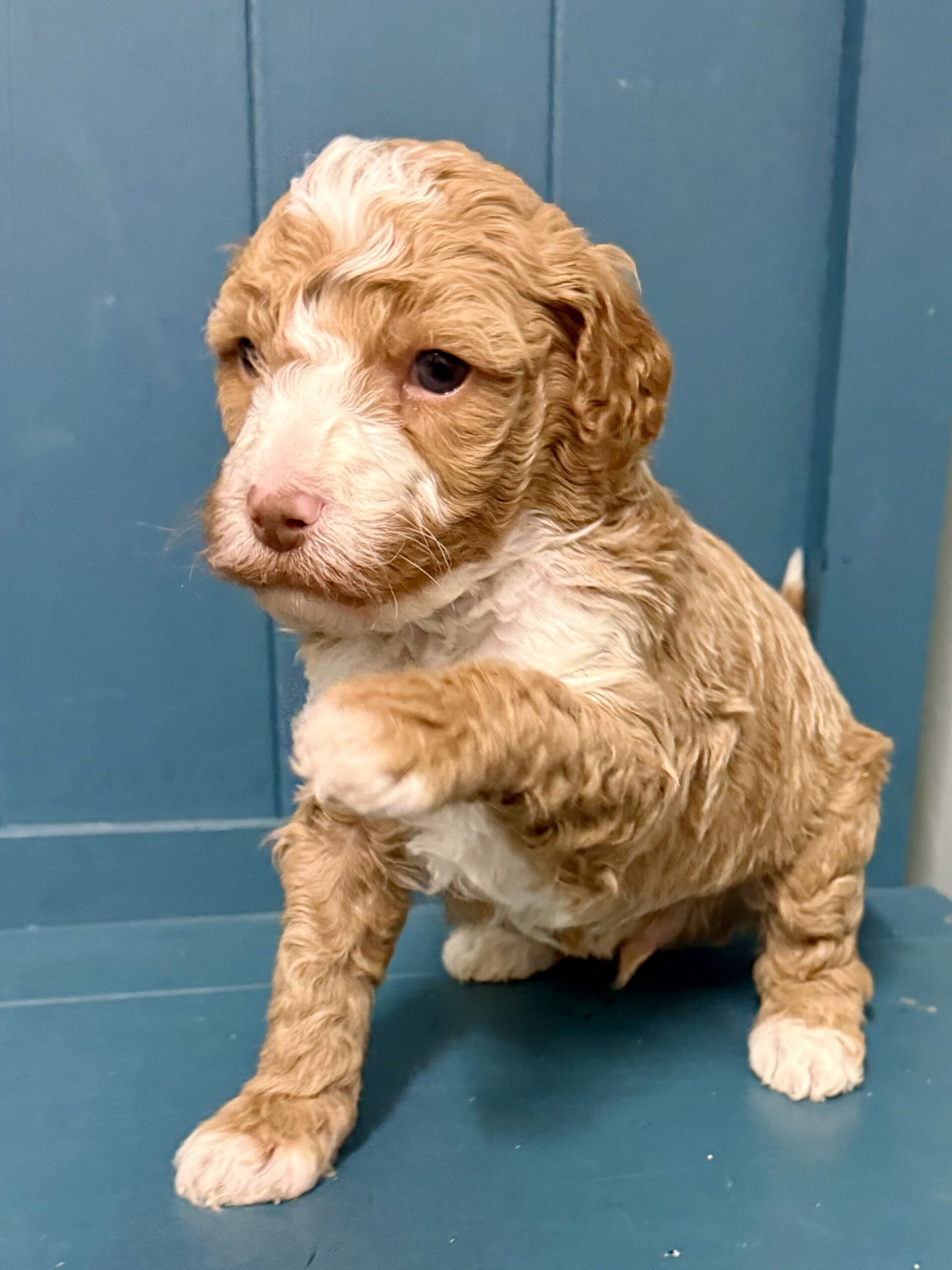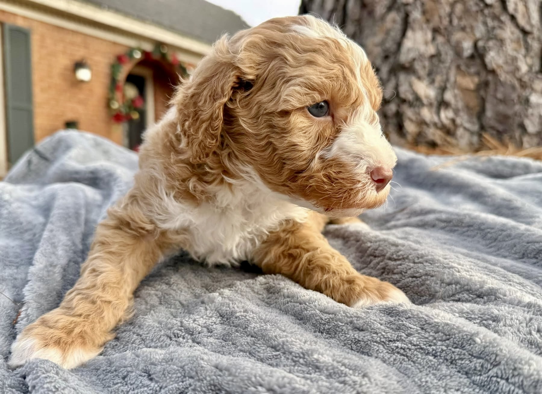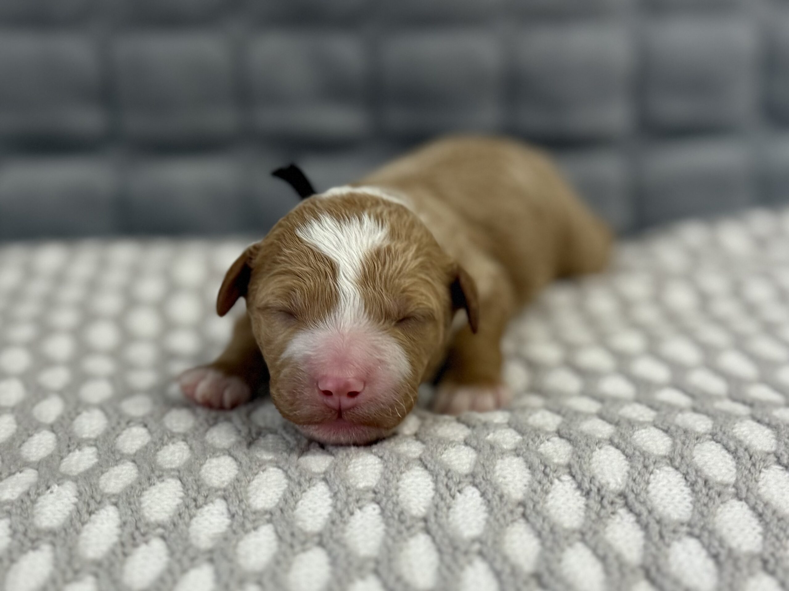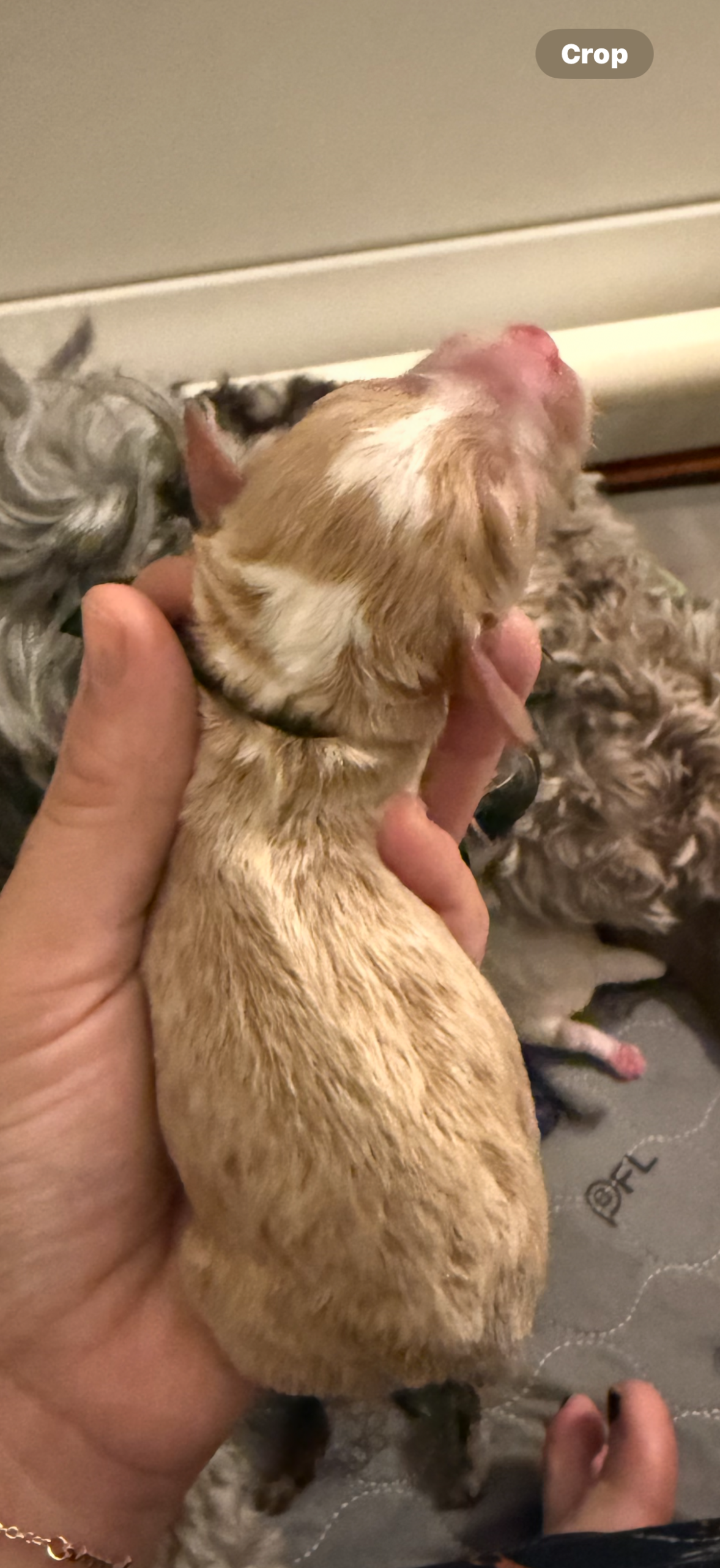 Zuma is from our Paw Patrol litter. He is an apricot color with a wavy coat currently but he likely will become darker red. We see that with these frosty looking pups. All of the puppies in this litter will be non-shedding. This litter was born November 18th and will be 8 weeks old January 13th. We will have a better idea as they grow but we expect them to be in the 20-25 range based on the parents.