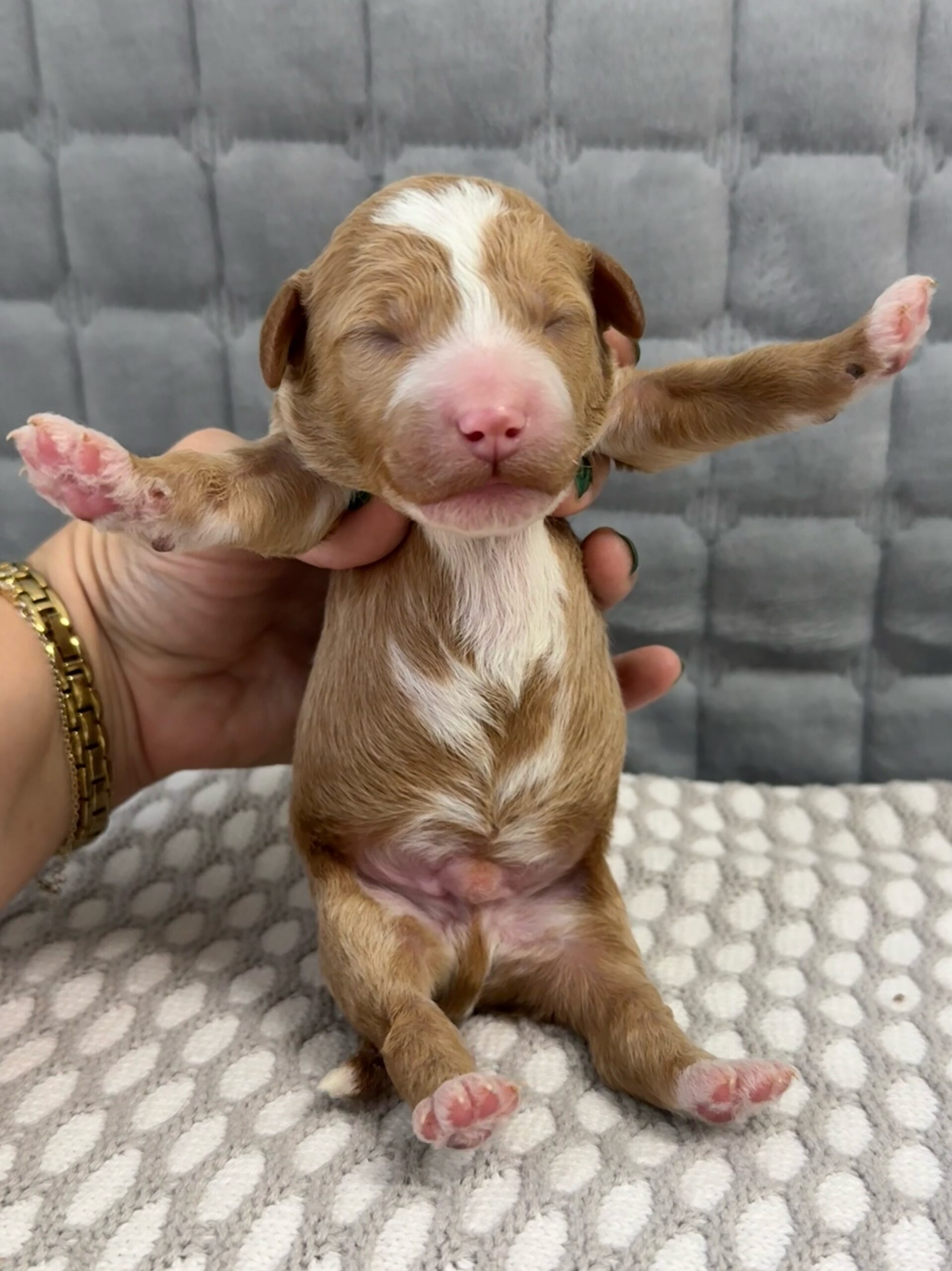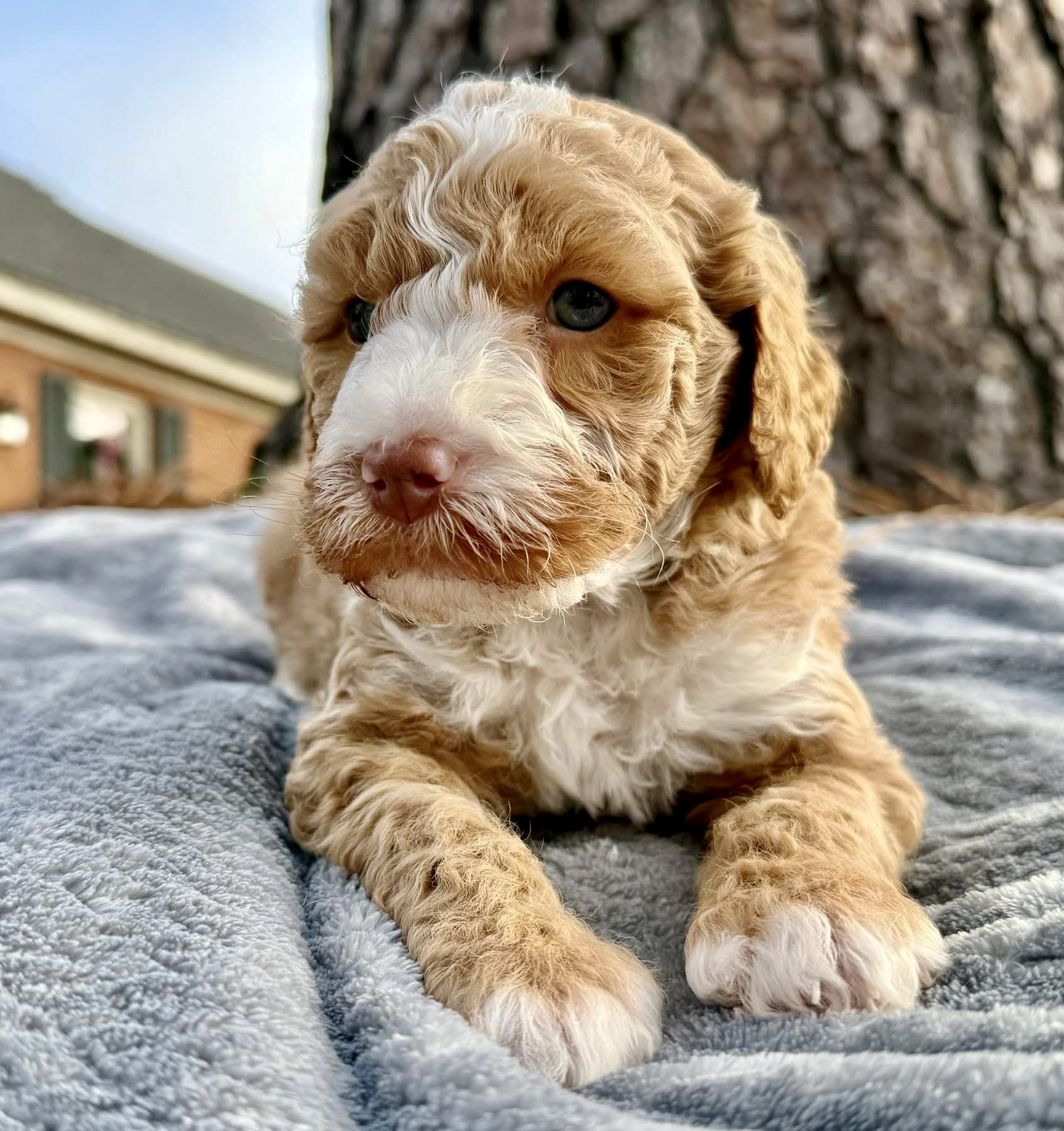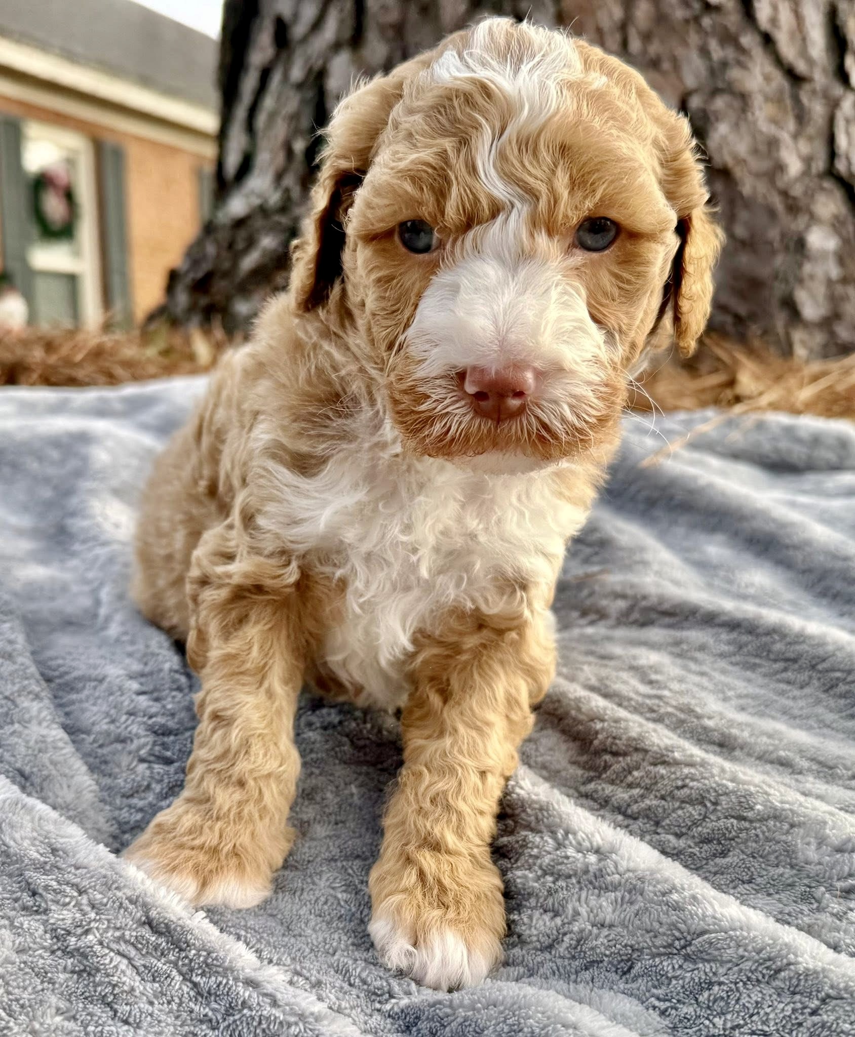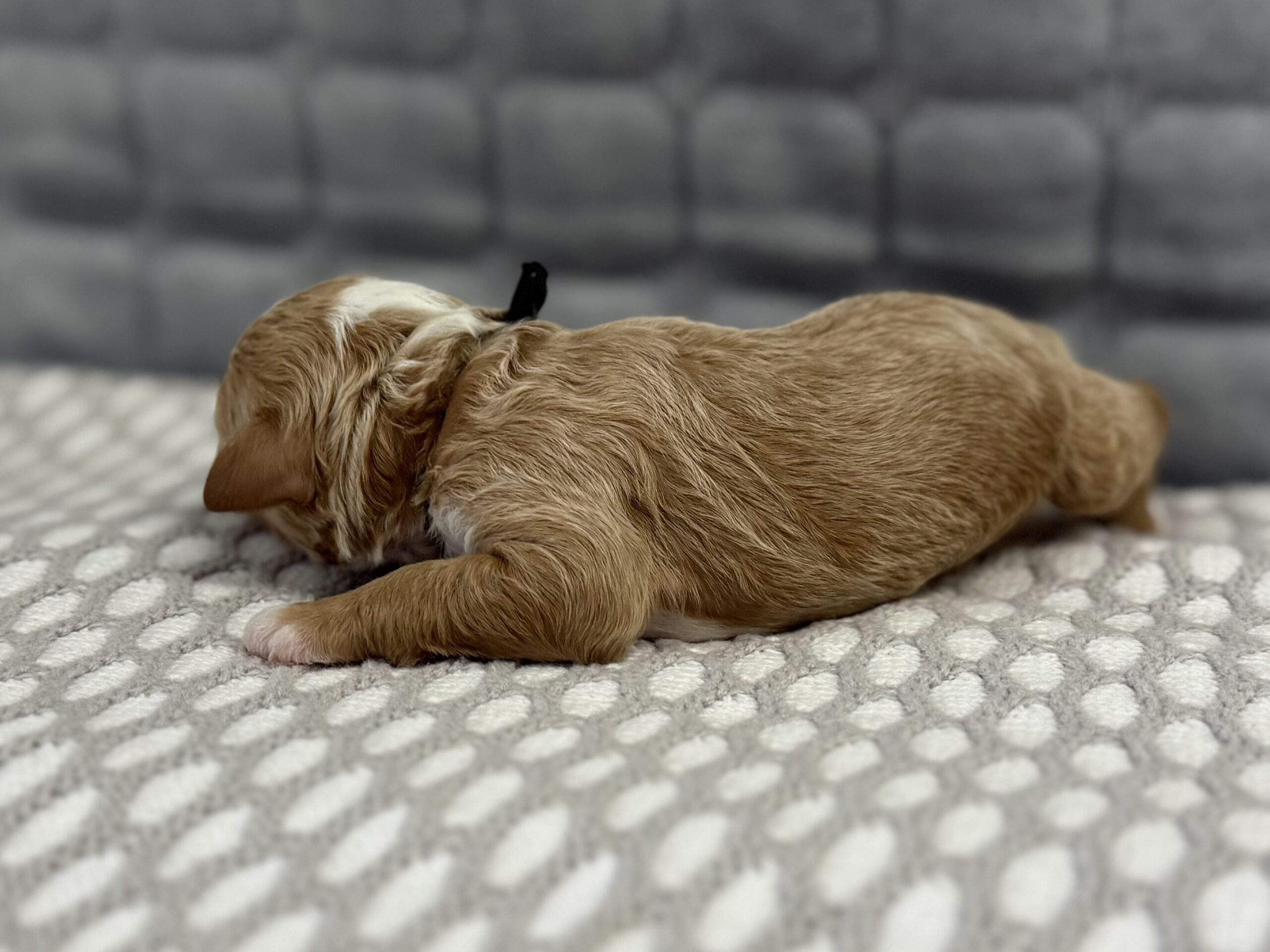Zuma is from our Paw Patrol litter. He is an apricot color with a wavy coat currently but he likely will become darker red. We see that with these frosty looking pups. All of the puppies in this litter will be non-shedding. This litter was born November 18th and will be 8 weeks old January 13th. We will have a better idea as they grow but we expect them to be in the 20-25 range based on the parents.